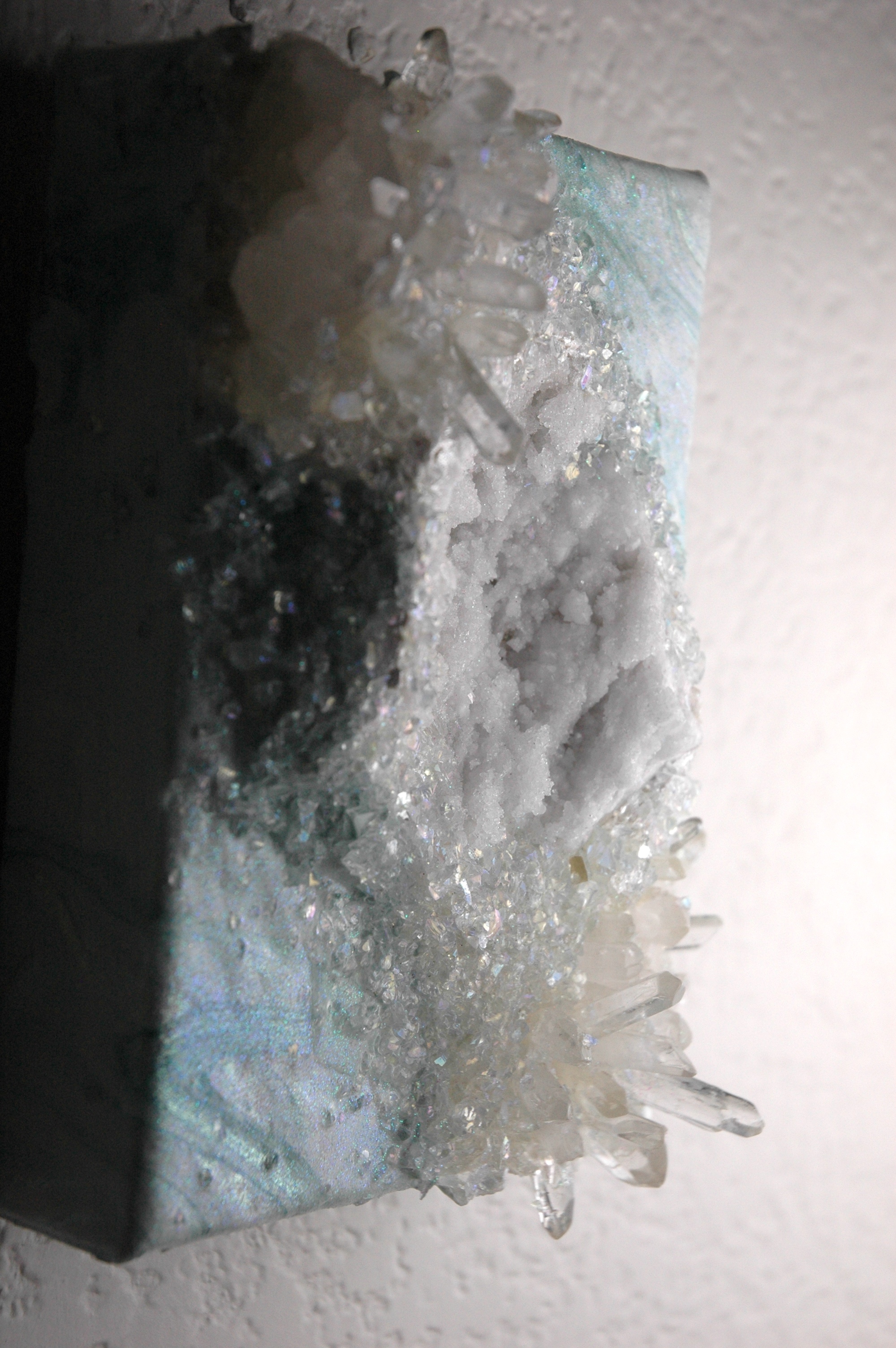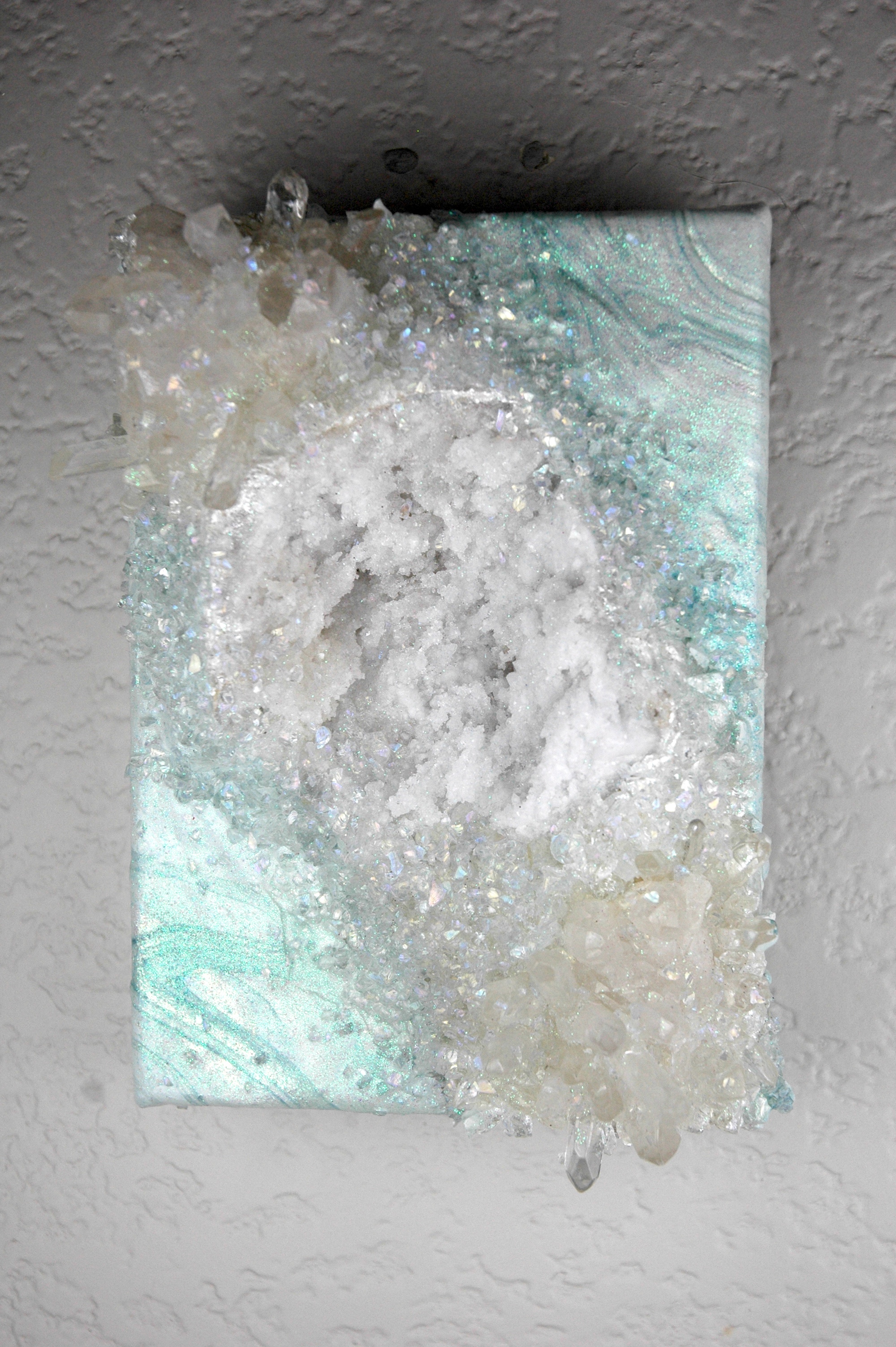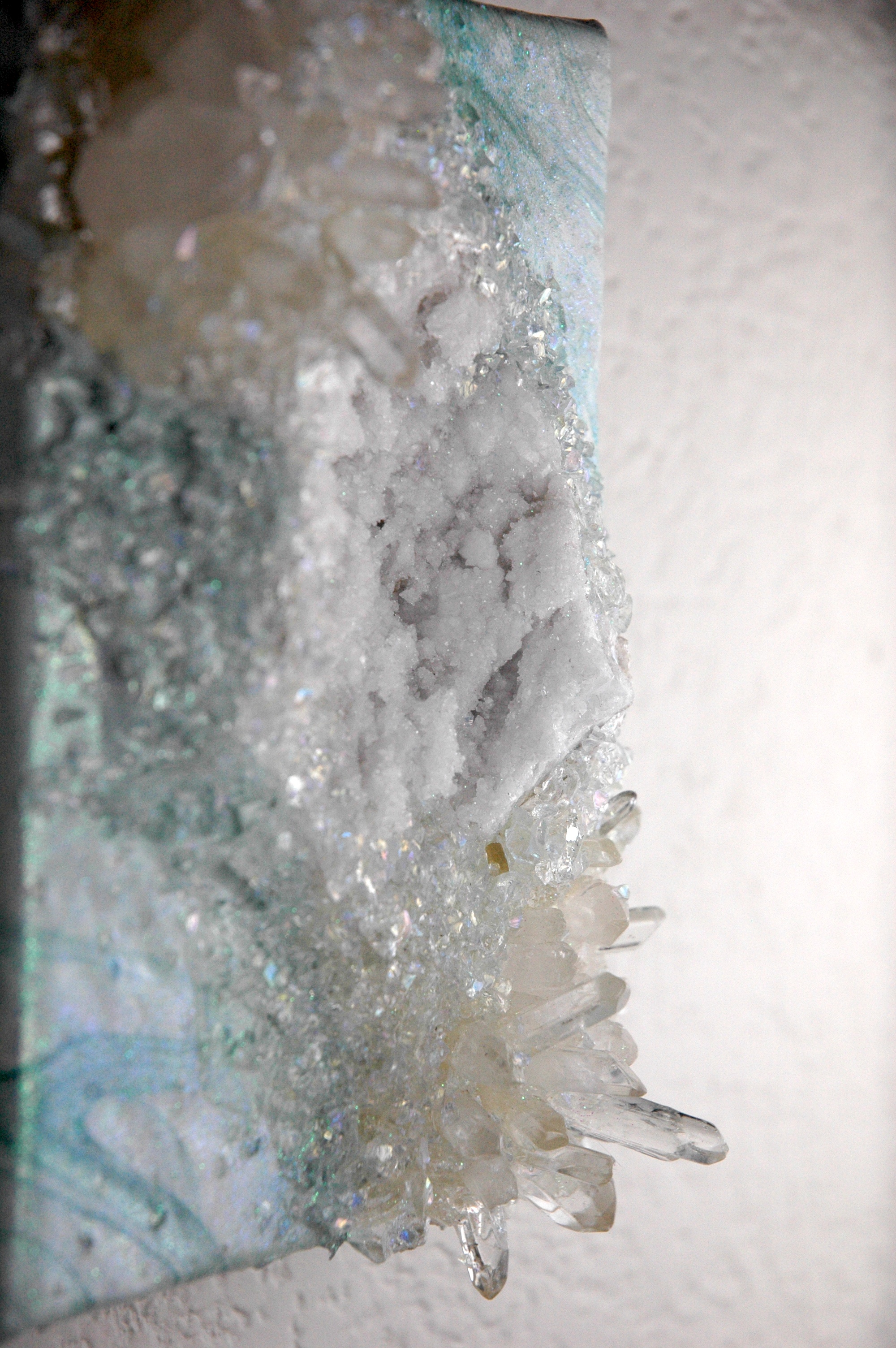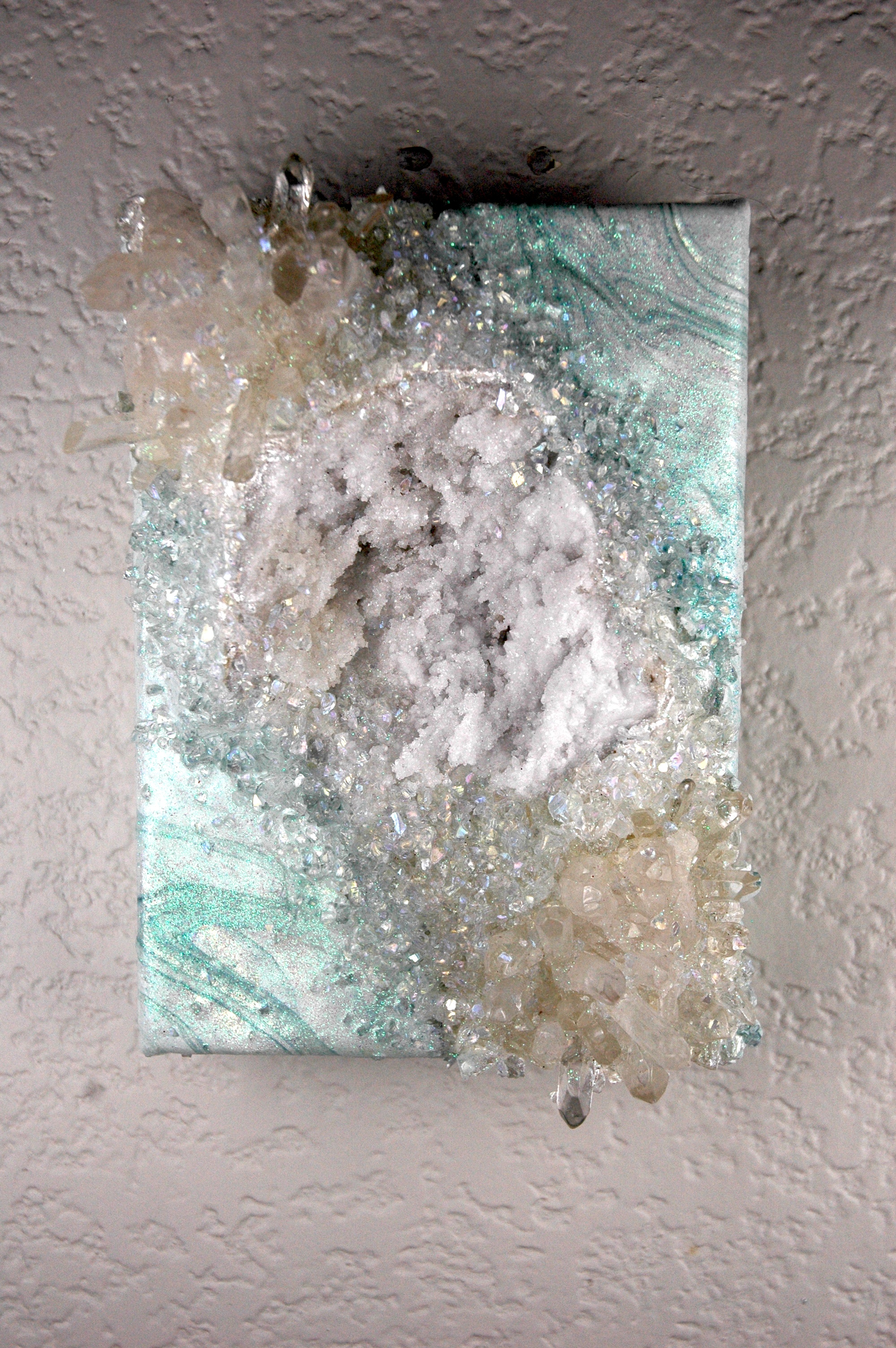 This was my first attempt at embedding a geode into a canvas. I wanted to start with a smaller size canvas for my first attempt. Normally I do reacher, but this time I didn't. I just went with the idea I had and it worked out. I added additional clear quartz crystals to make a pleasing composition and built the smaller crushed crystal pieces around the embedded geode to make it look as if it was naturally coming out of the canvas. Just like all my pieces this one took additional steps with drying time between.