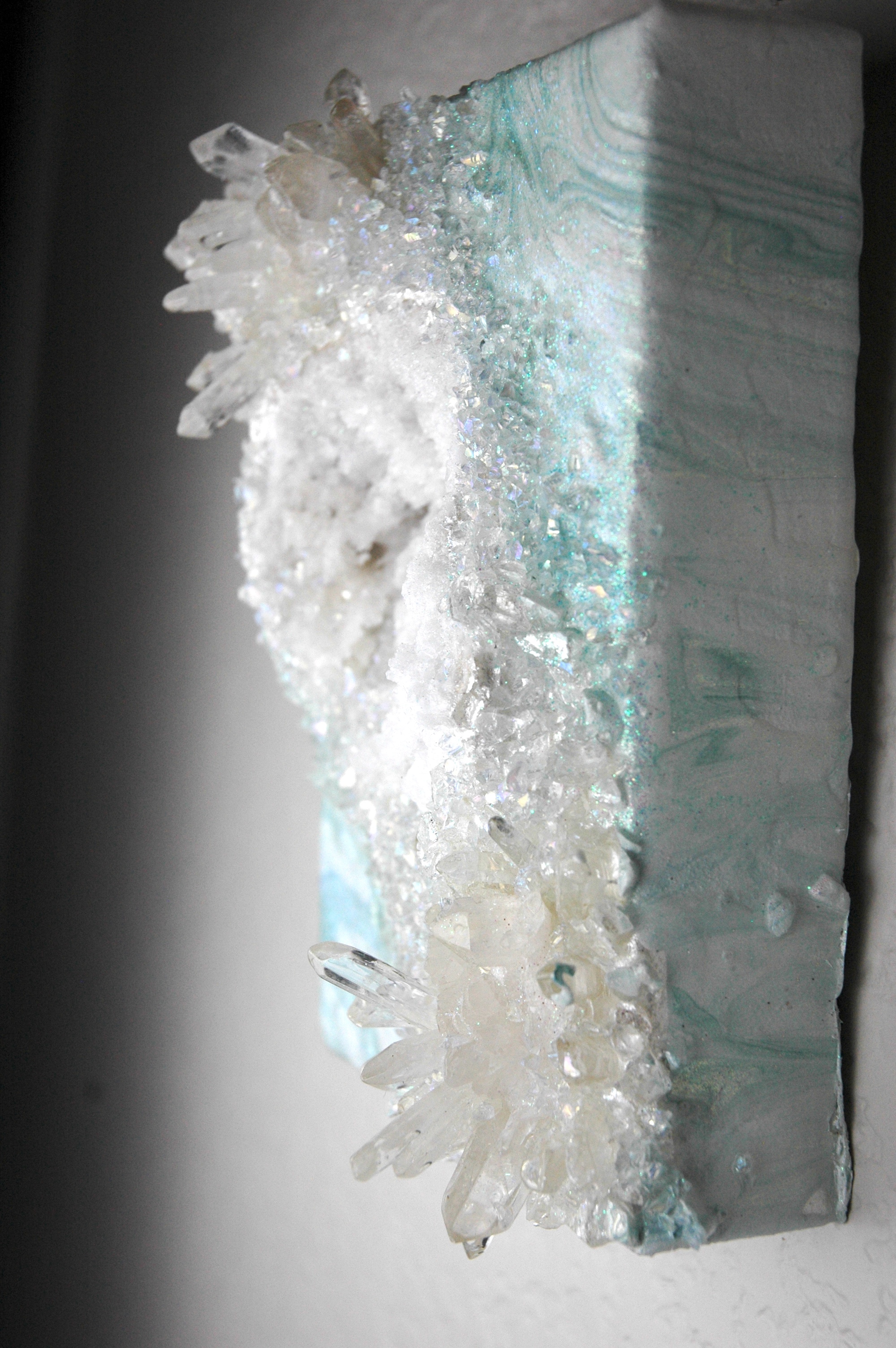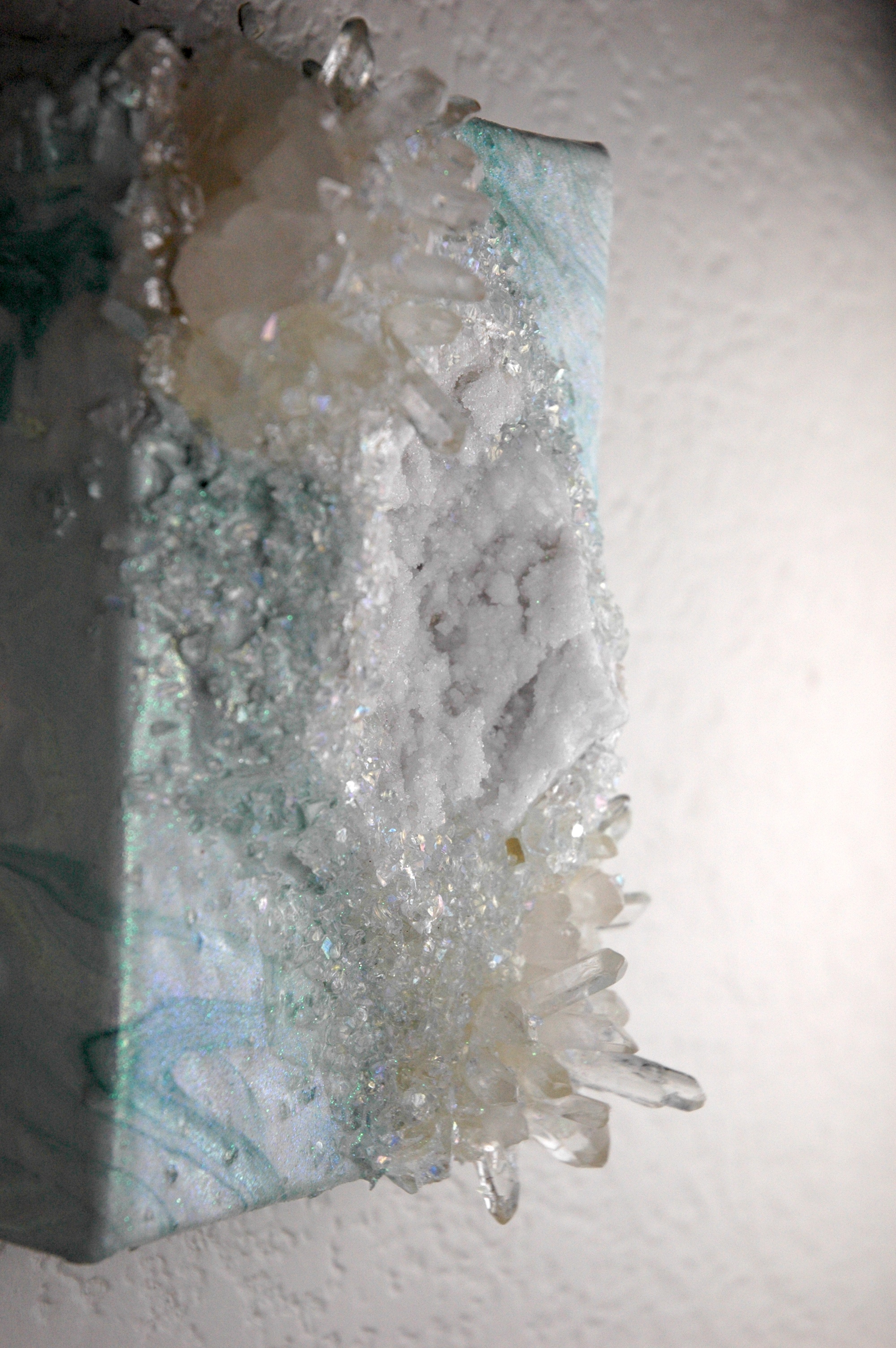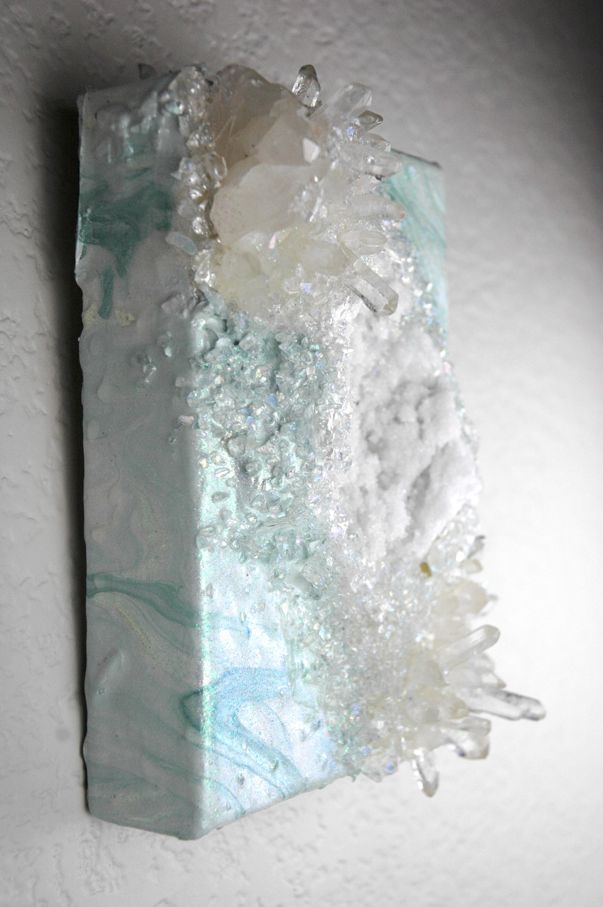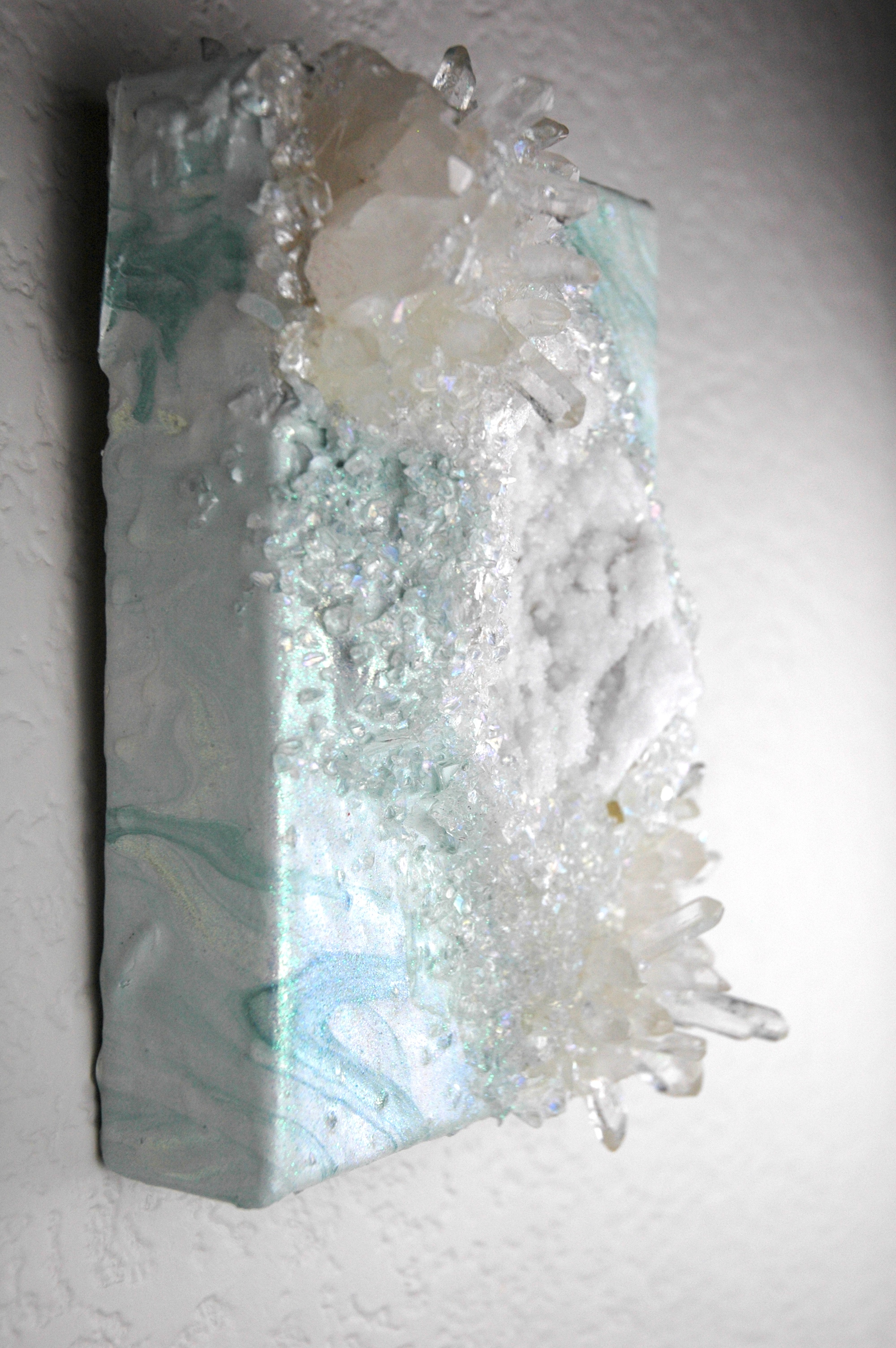 This was my first attempt at embedding a geode into a canvas. I wanted to start with a smaller size canvas for my first attempt. Normally I do reacher, but this time I didn't. I just went with the idea I had and it worked out. I added additional clear quartz crystals to make a pleasing composition and built the smaller crushed crystal pieces around the embedded geode to make it look as if it was naturally coming out of the canvas. Just like all my pieces this one took additional steps with drying time between.