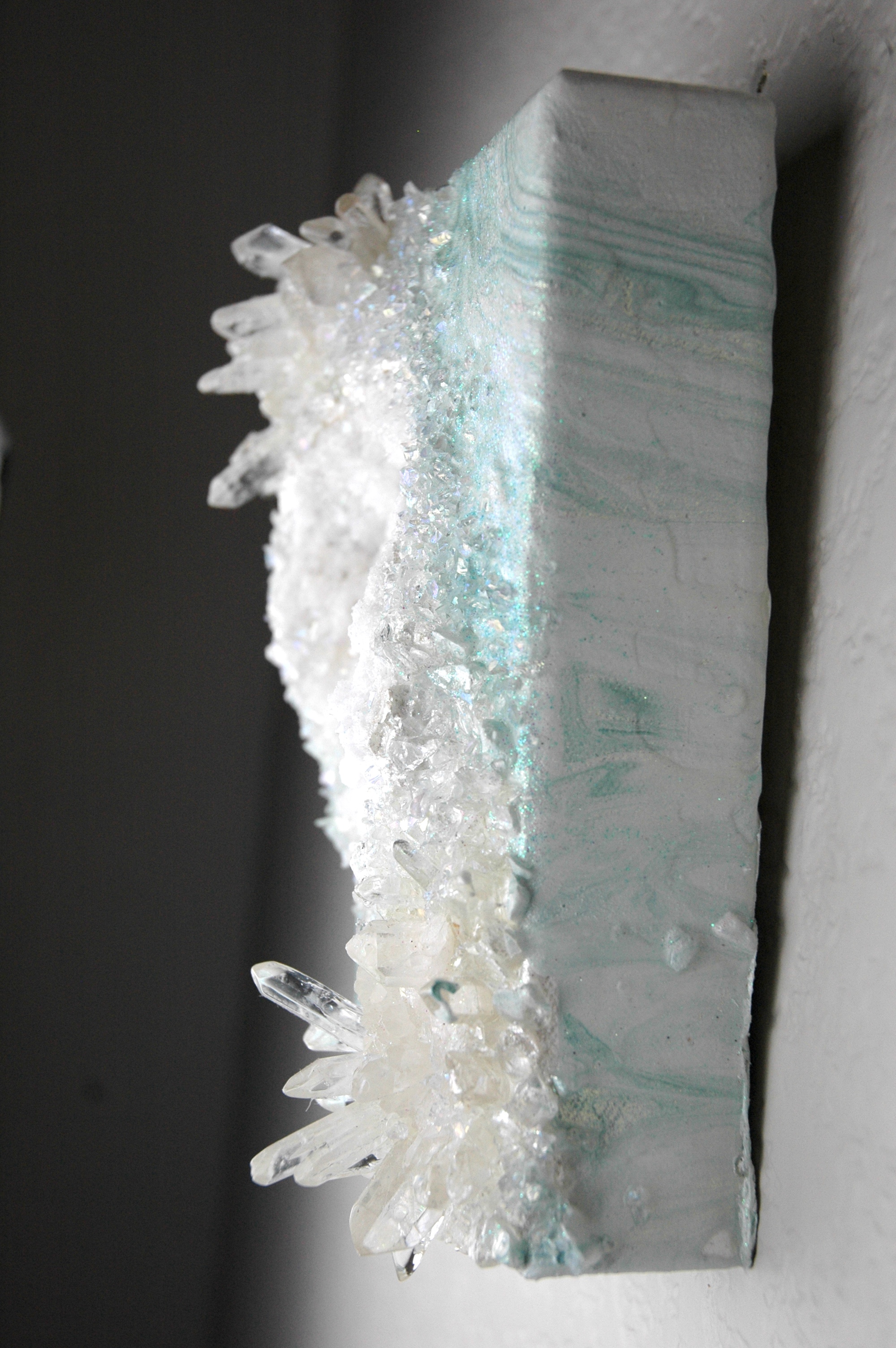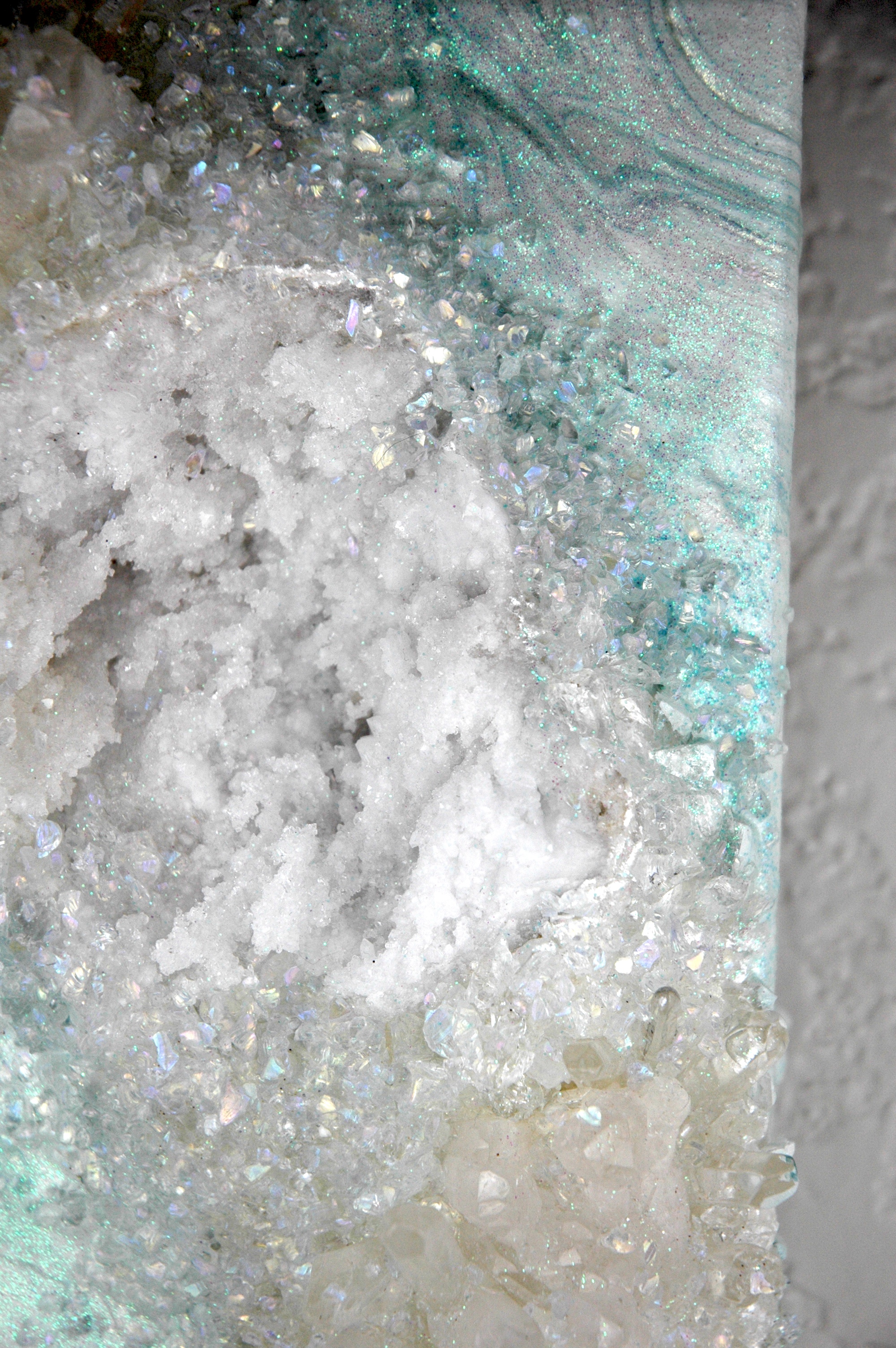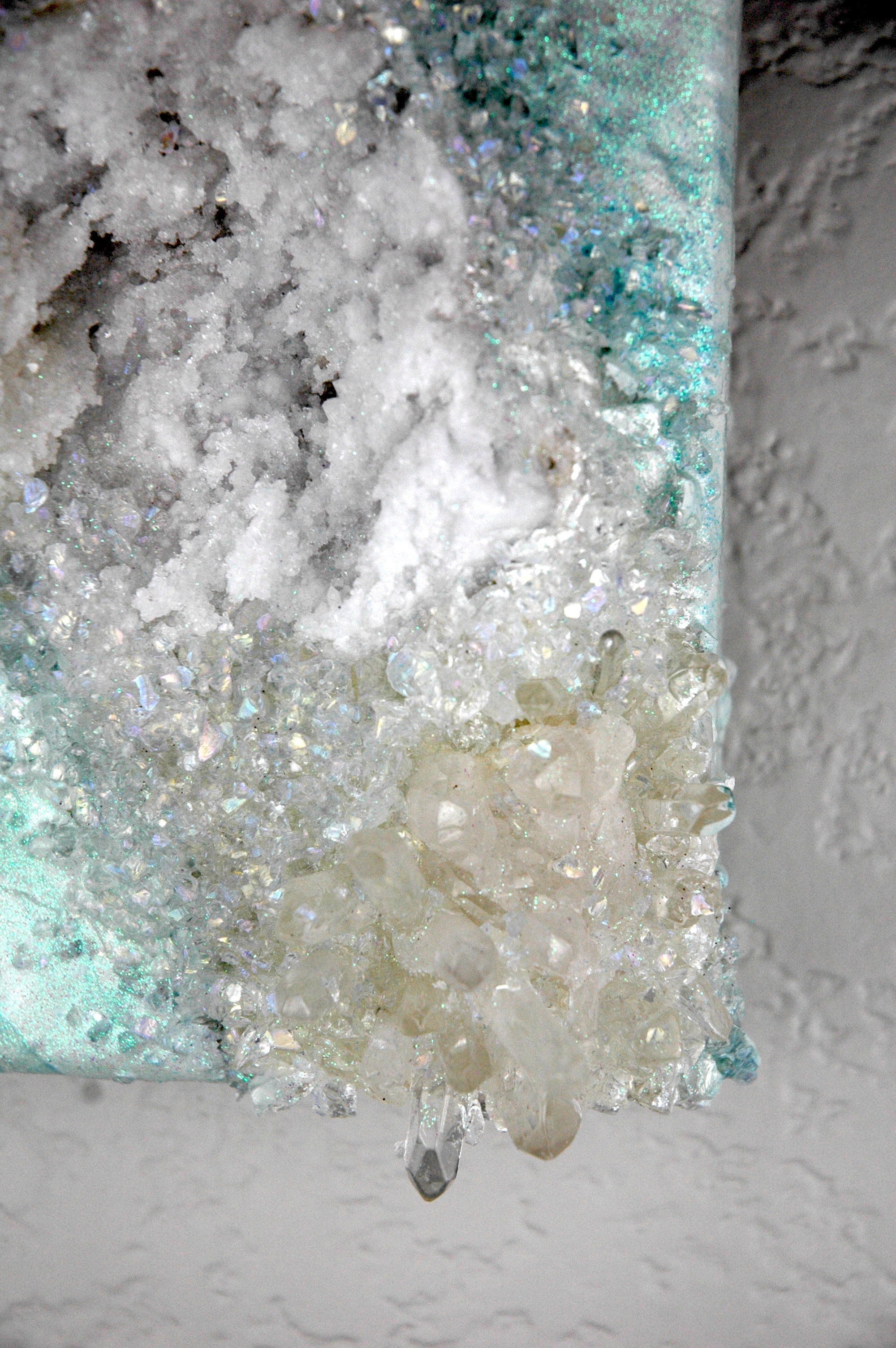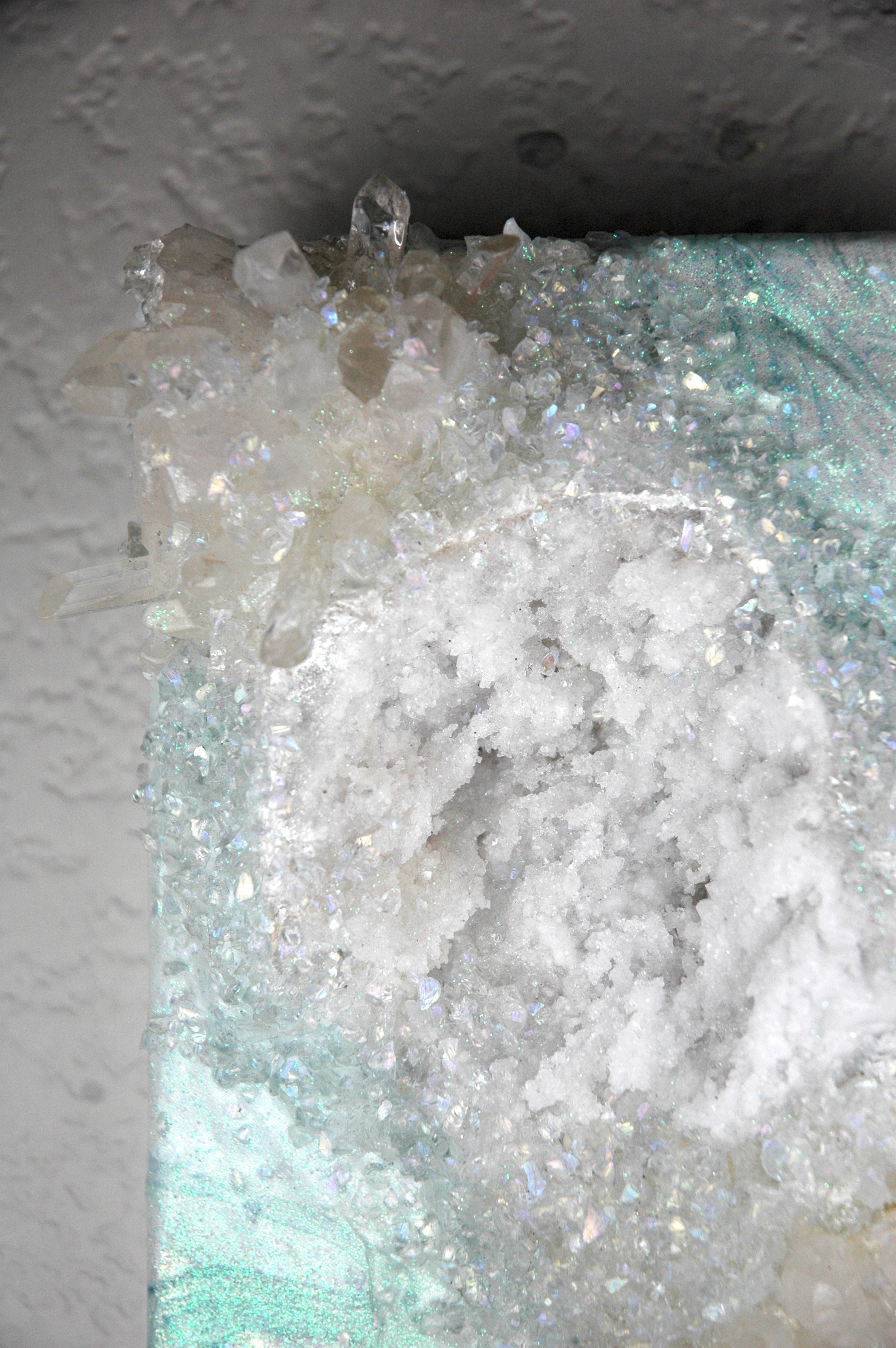 This was my first attempt at embedding a geode into a canvas. I wanted to start with a smaller size canvas for my first attempt. Normally I do reacher, but this time I didn't. I just went with the idea I had and it worked out. I added additional clear quartz crystals to make a pleasing composition and built the smaller crushed crystal pieces around the embedded geode to make it look as if it was naturally coming out of the canvas. Just like all my pieces this one took additional steps with drying time between.