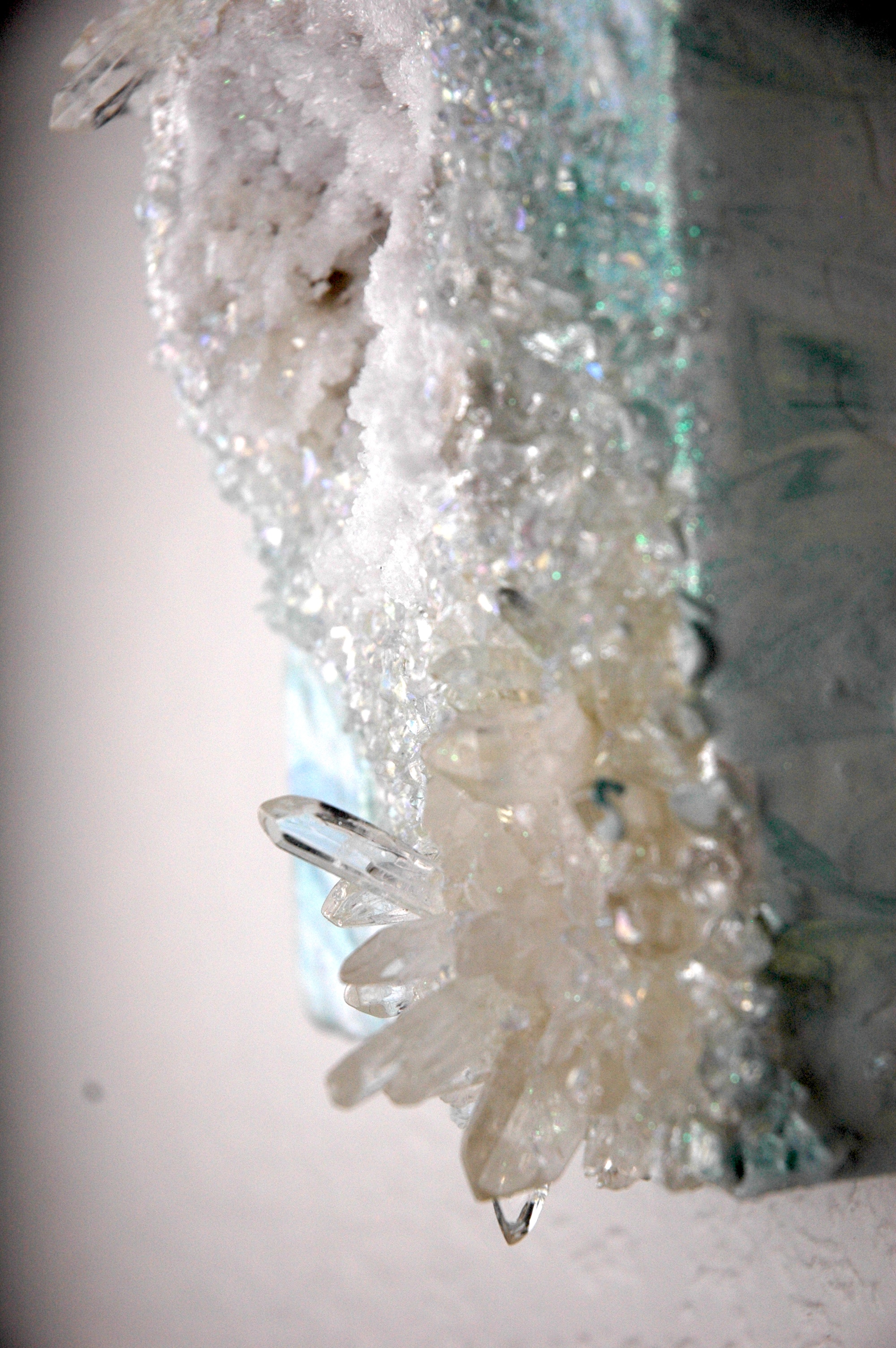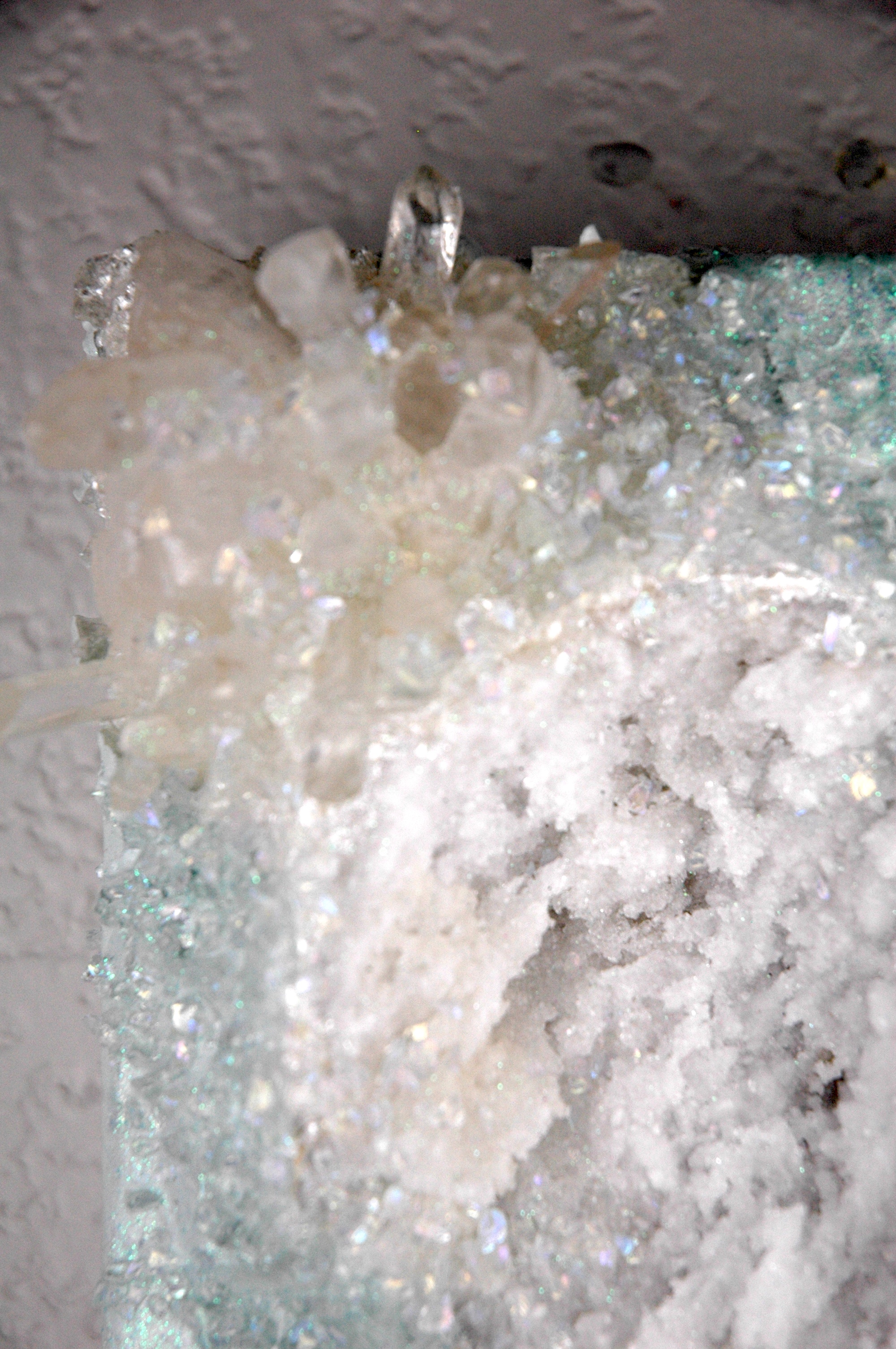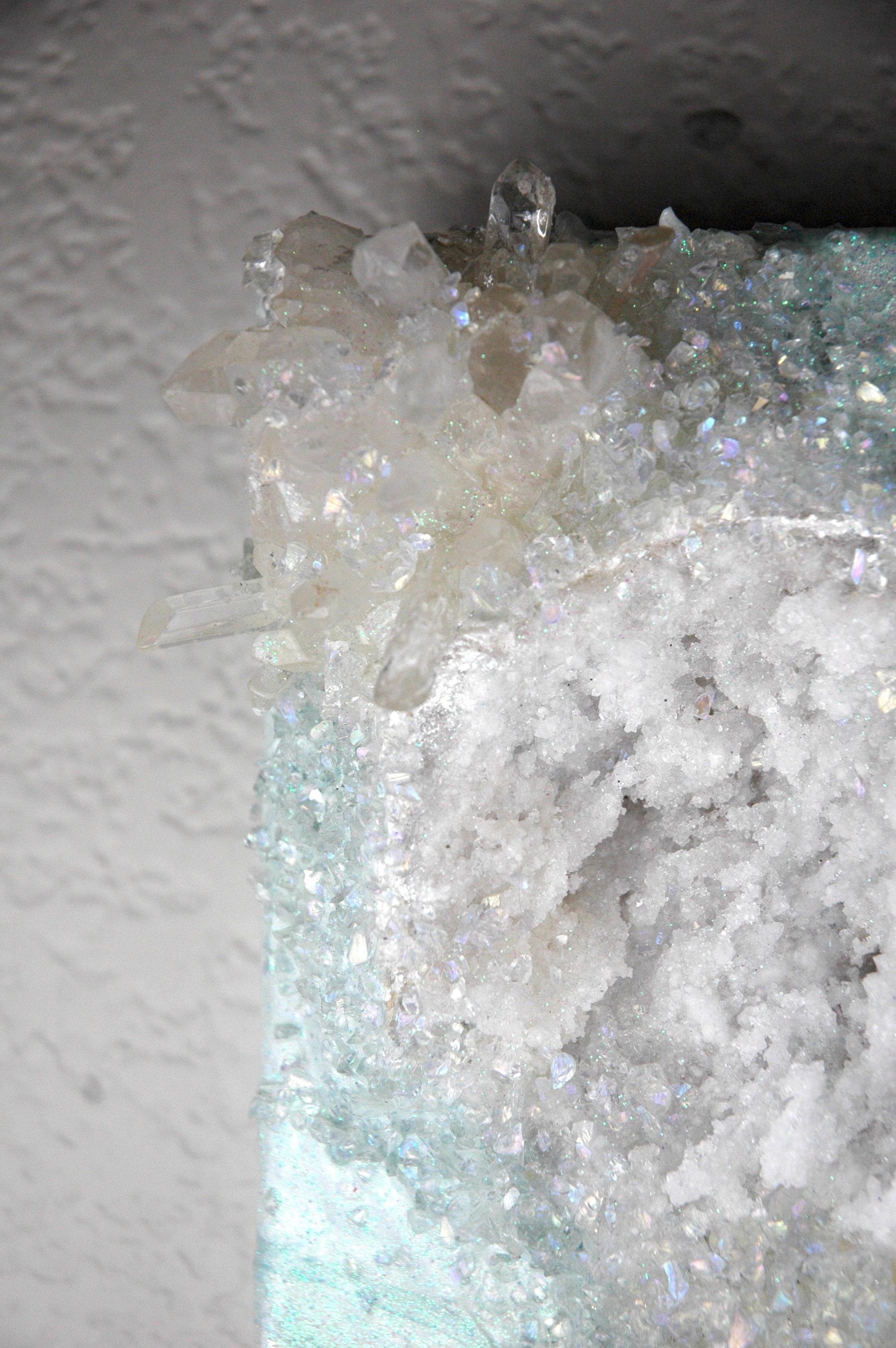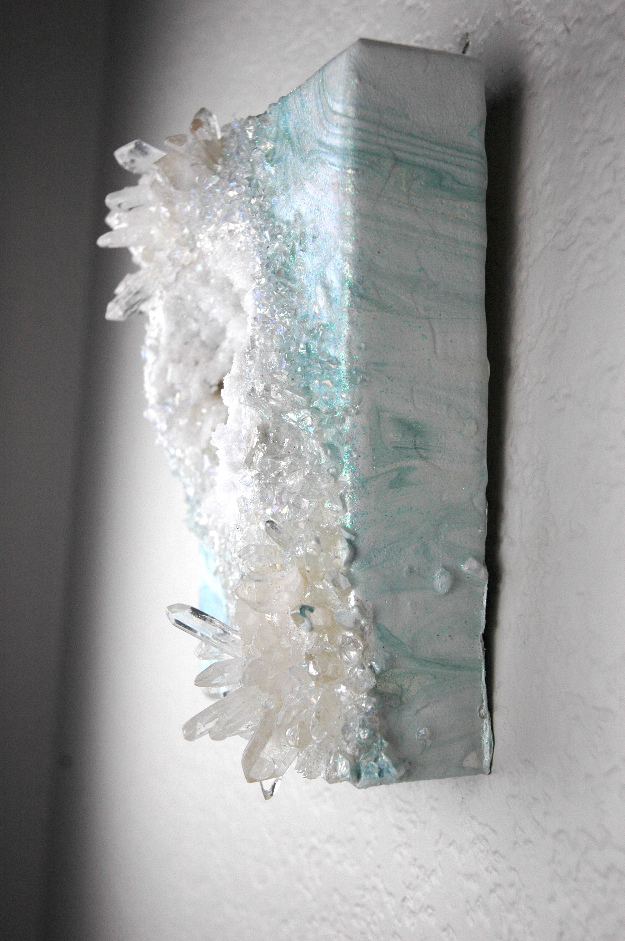 This was my first attempt at embedding a geode into a canvas. I wanted to start with a smaller size canvas for my first attempt. Normally I do reacher, but this time I didn't. I just went with the idea I had and it worked out. I added additional clear quartz crystals to make a pleasing composition and built the smaller crushed crystal pieces around the embedded geode to make it look as if it was naturally coming out of the canvas. Just like all my pieces this one took additional steps with drying time between.