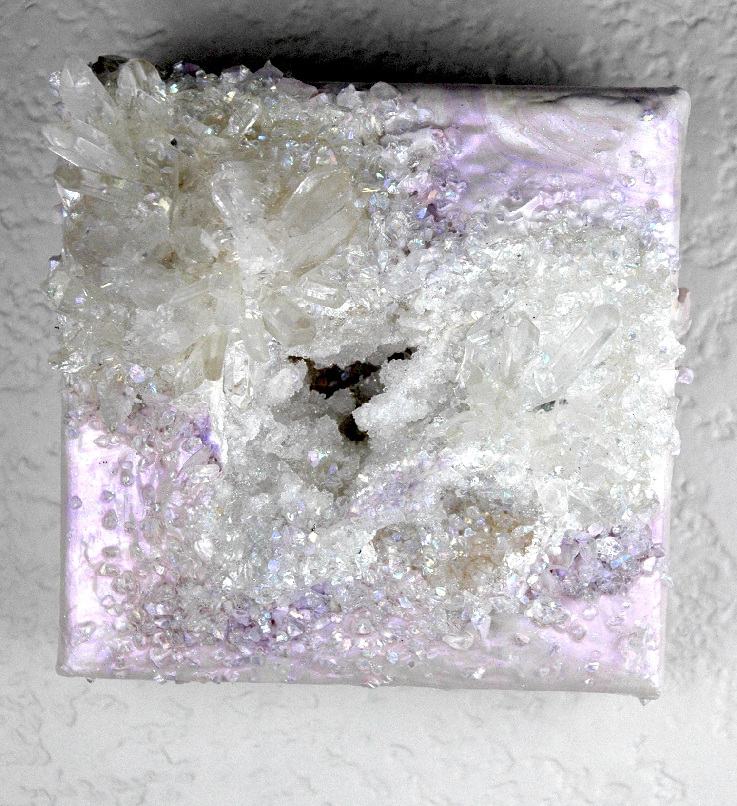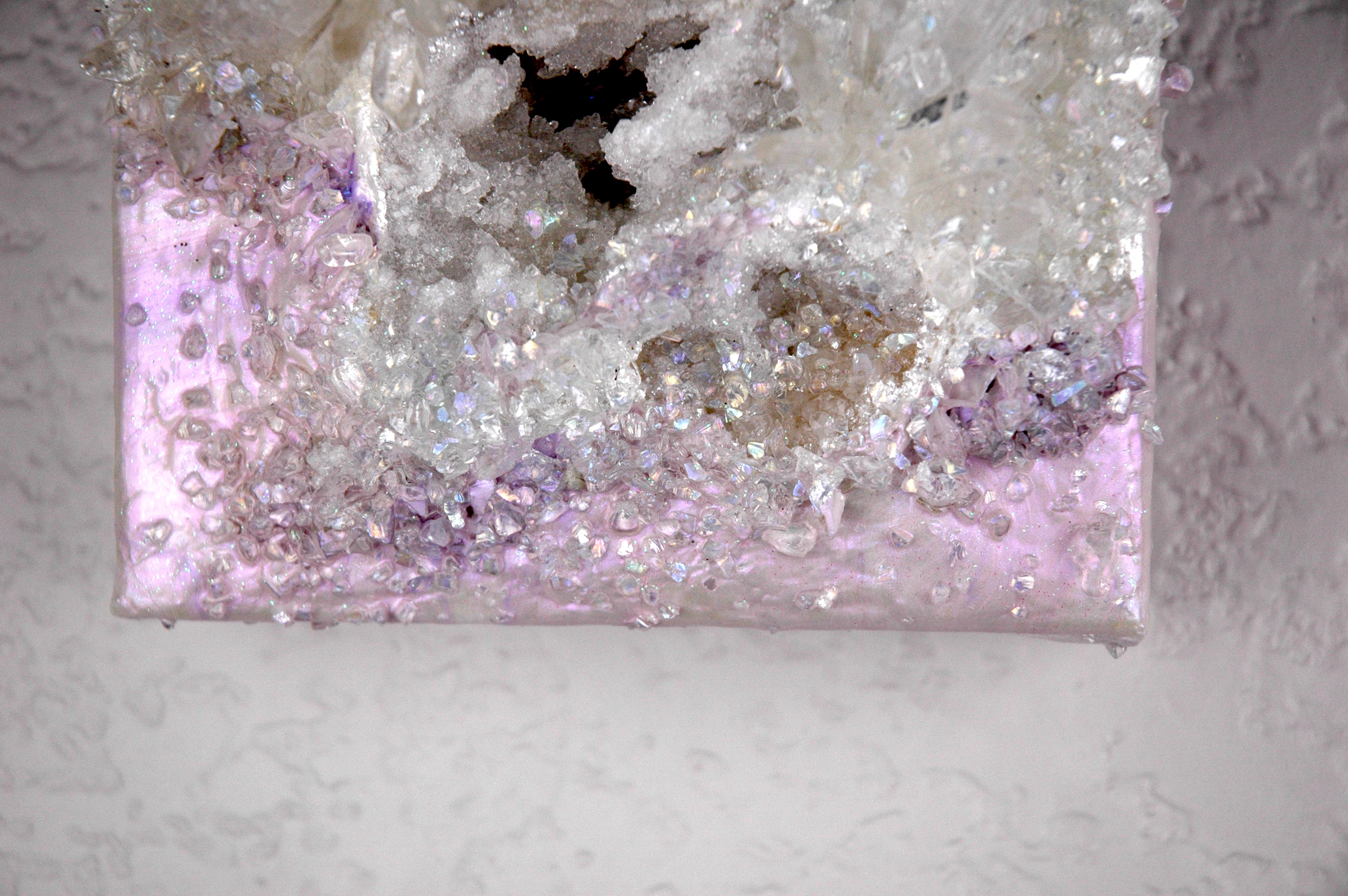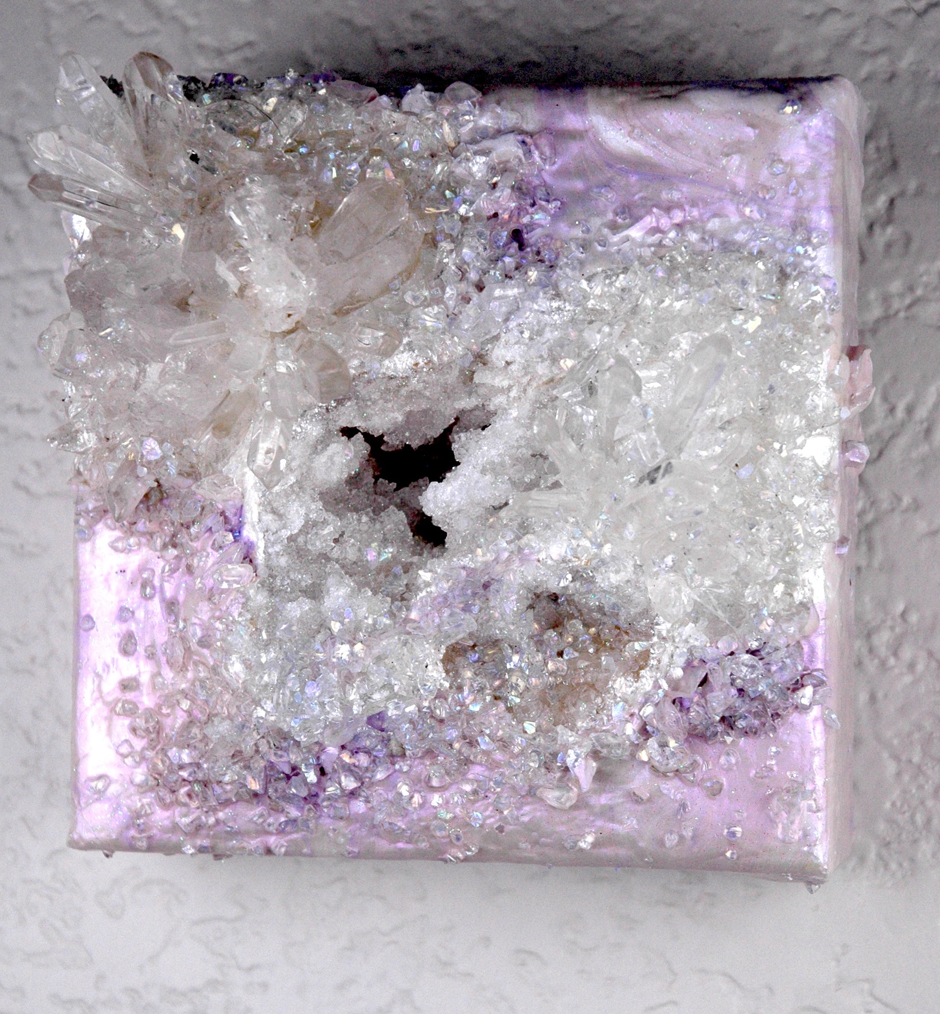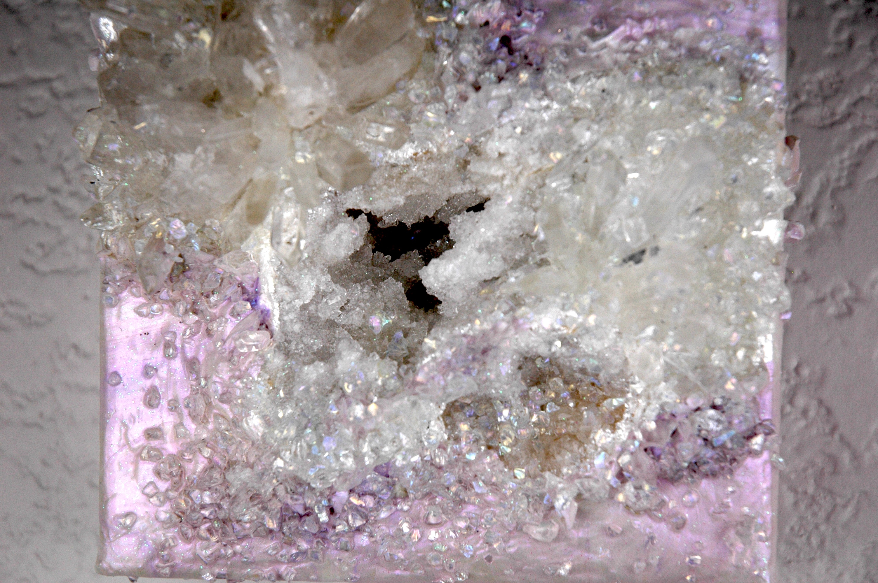 I wanted to embed 2 geodes into this piece, which took additional prep. I was able to place and blend the small crystals around the geodes to make an eye catching design. Then I added the paint and glitter to the small areas of canvas not covered by the crystals.