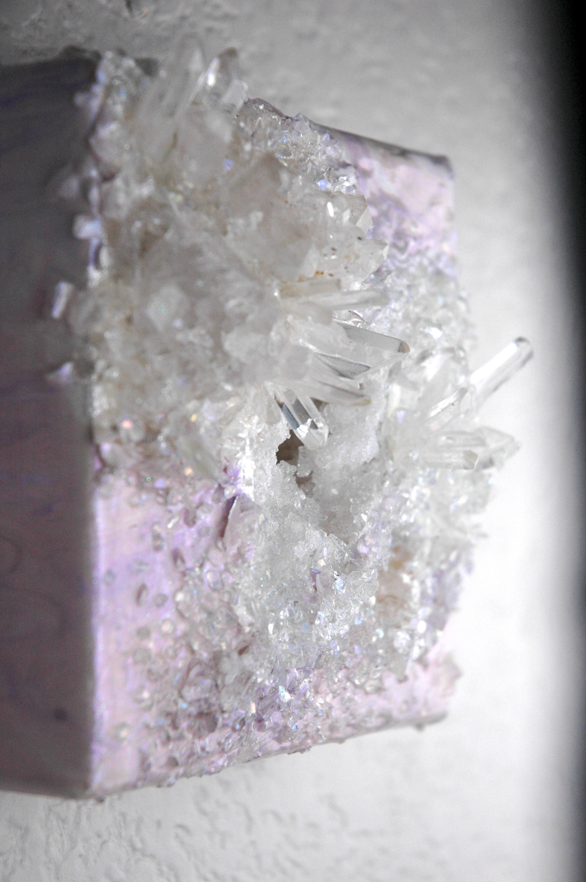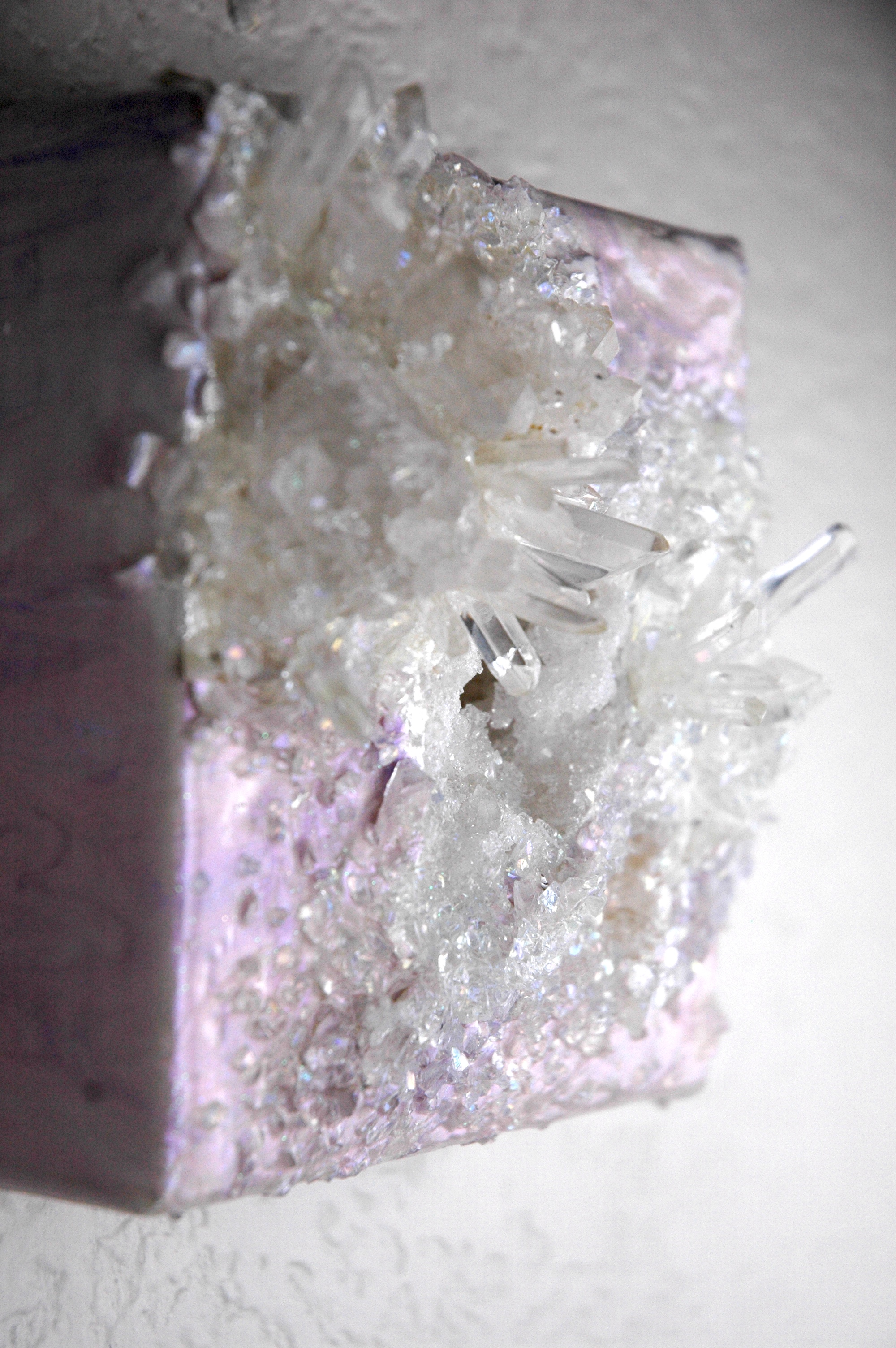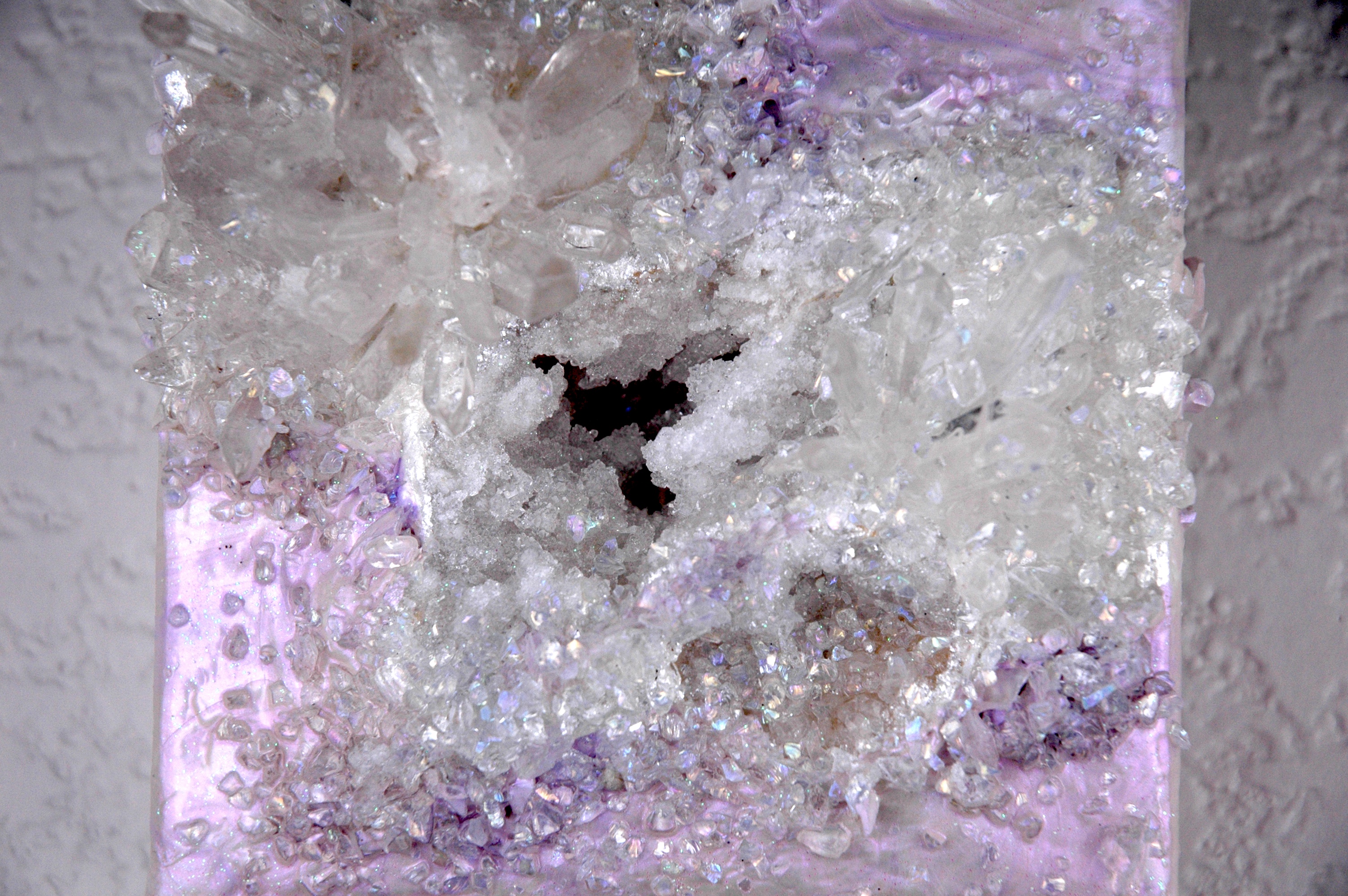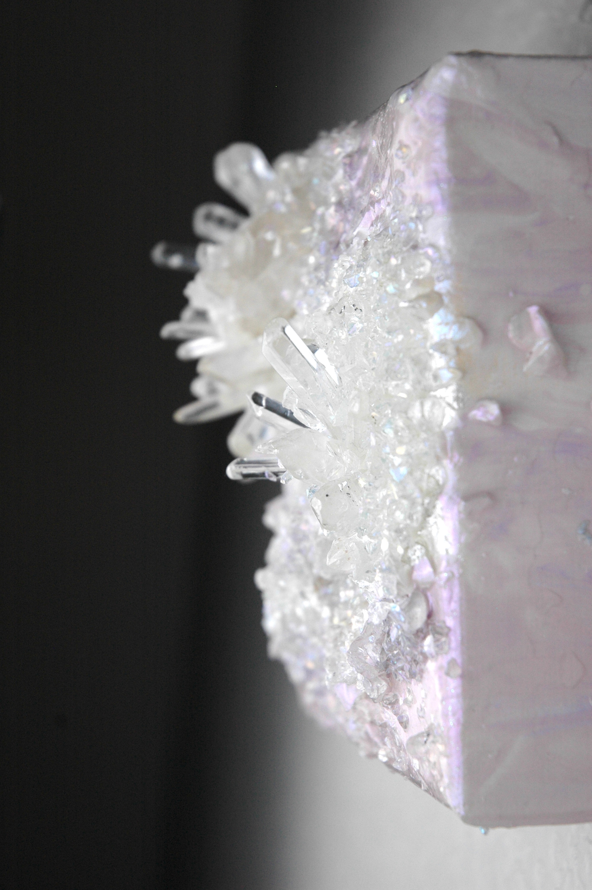 I wanted to embed 2 geodes into this piece, which took additional prep. I was able to place and blend the small crystals around the geodes to make an eye catching design. Then I added the paint and glitter to the small areas of canvas not covered by the crystals.
