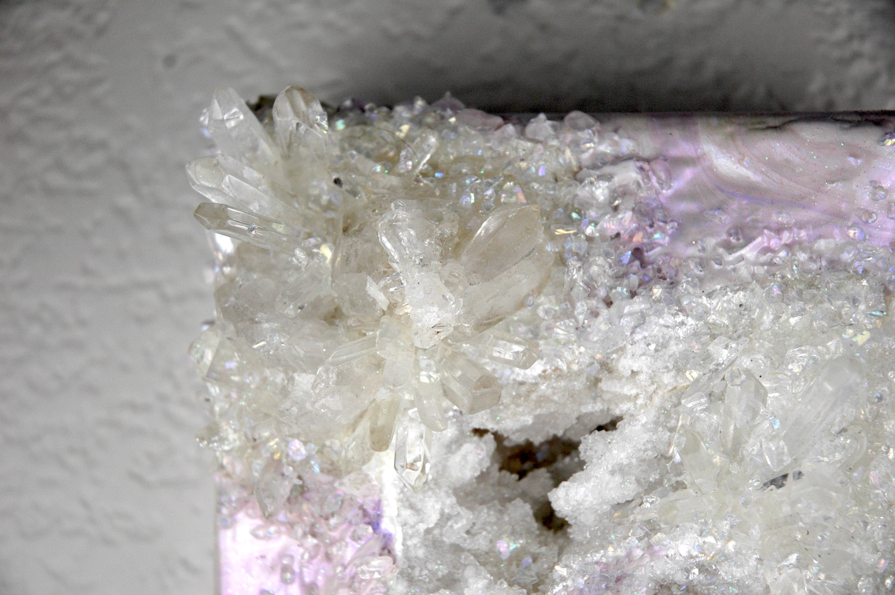 Delicate Pearl has two embedded quartz geodes. They tunnel pretty deep for their small size. These embedded quartz geodes are surrounded by additional quartz crystals. The color palette is a pearlescent purple that shines a gorgeous iridescent glow.