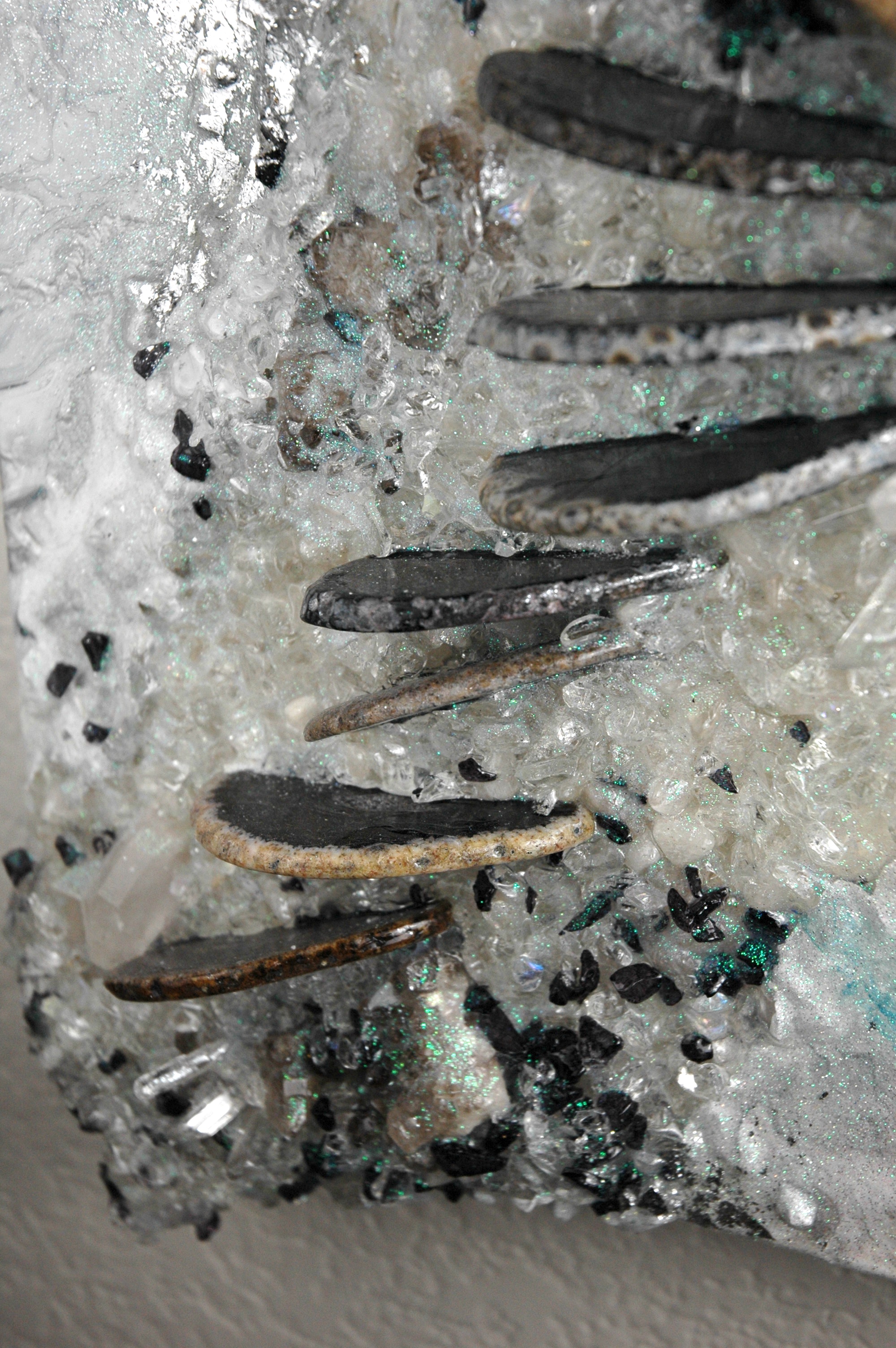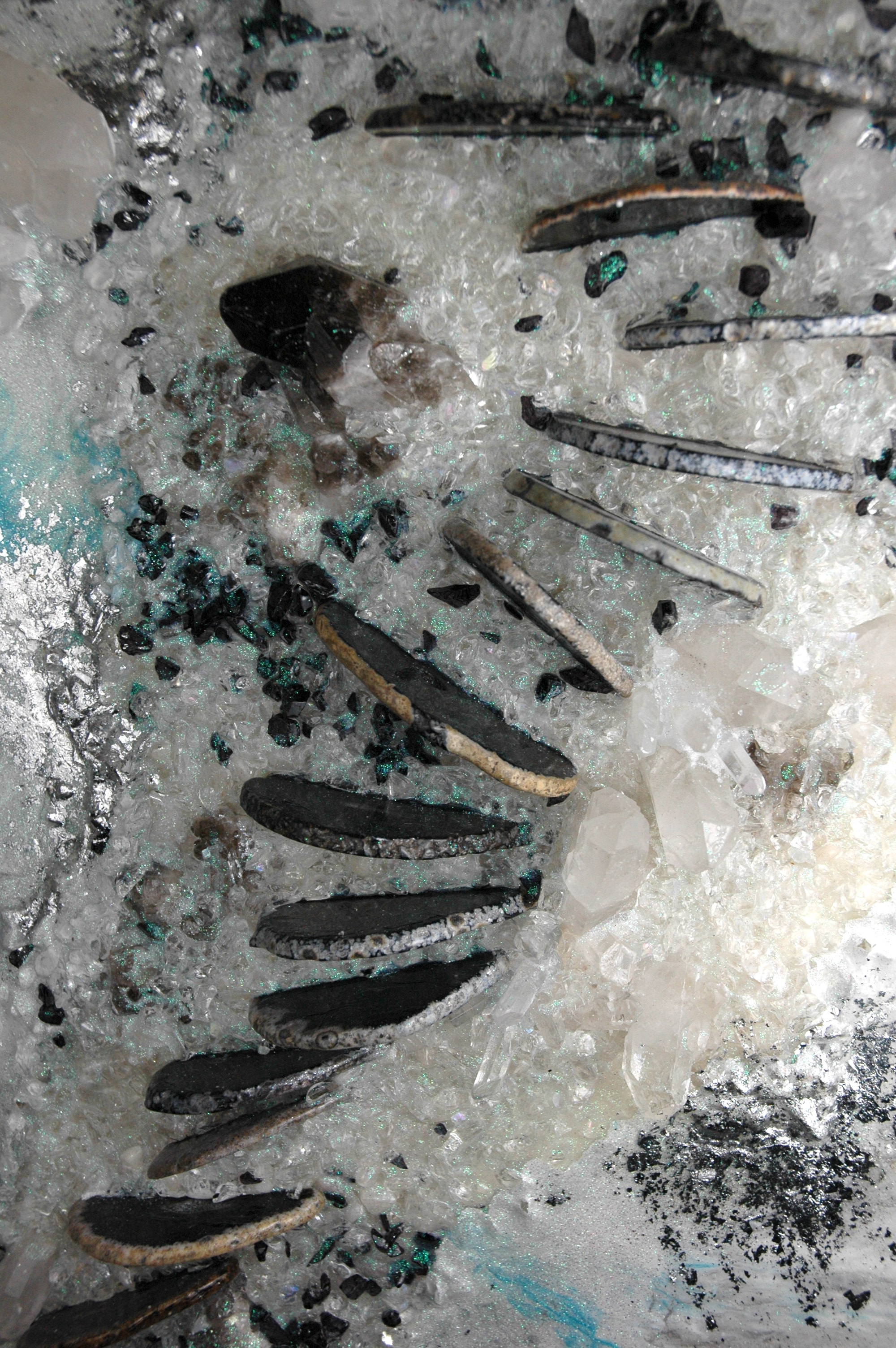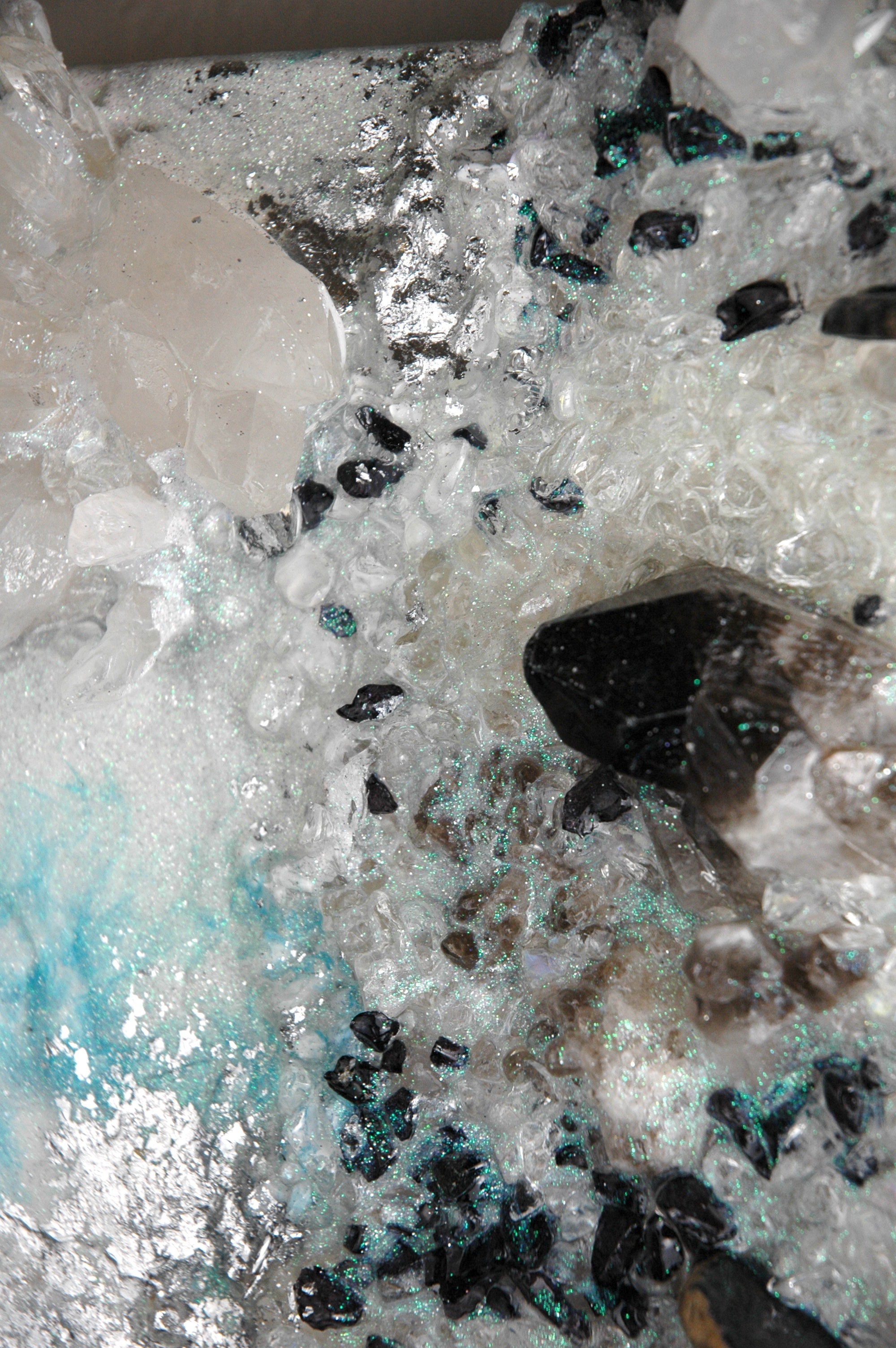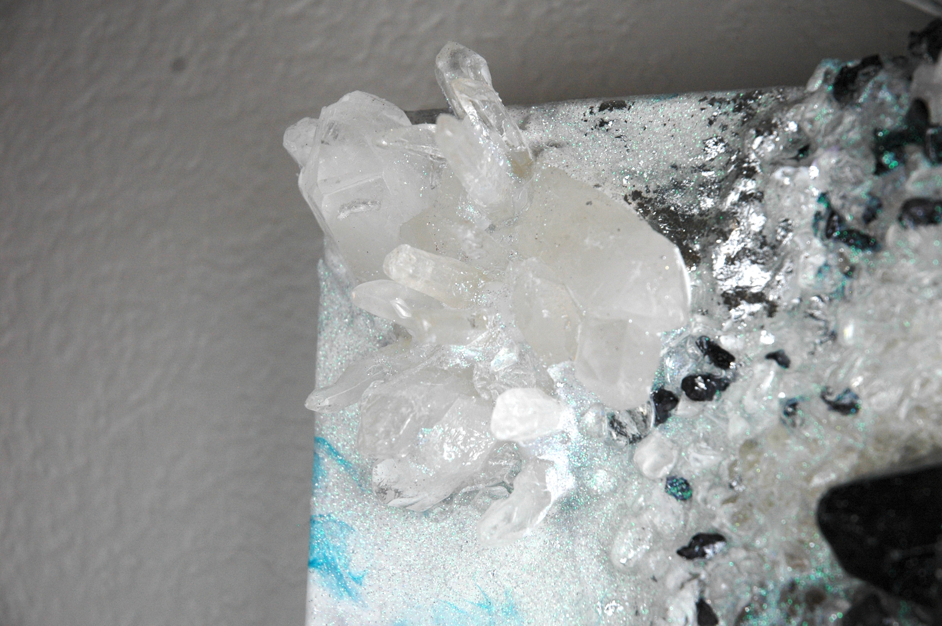 Since I had never applied geode slices to a canvas before—and hadn’t seen any artwork that used them in this way—there were no existing techniques or tricks for me to follow. However, my strong understanding of how my materials behave helped me develop a method to apply the slices with minimal support, preserving their delicate, thin shape. By strategically adding additional crystal pieces to specific areas I was able to enhance the overall look.