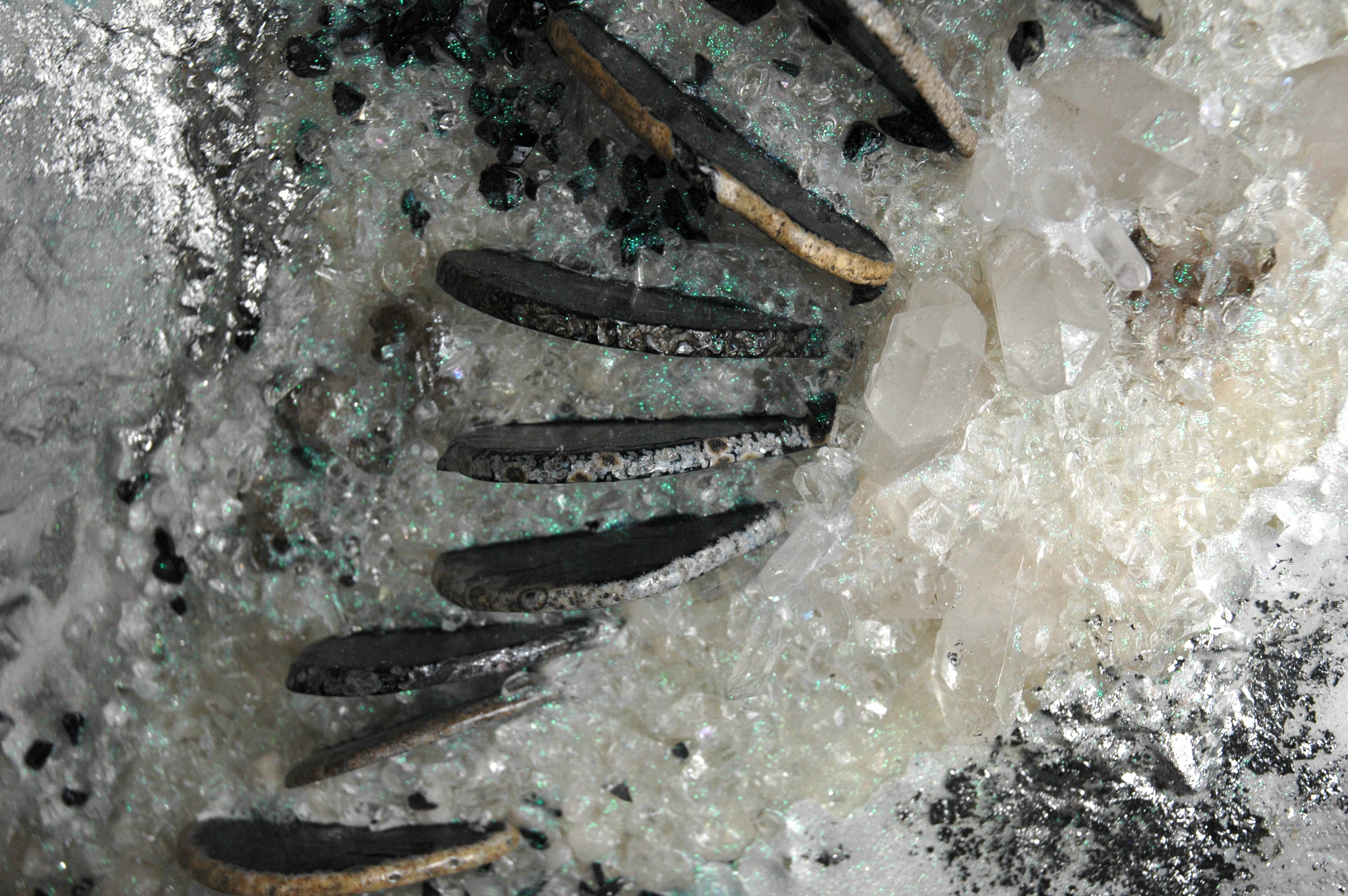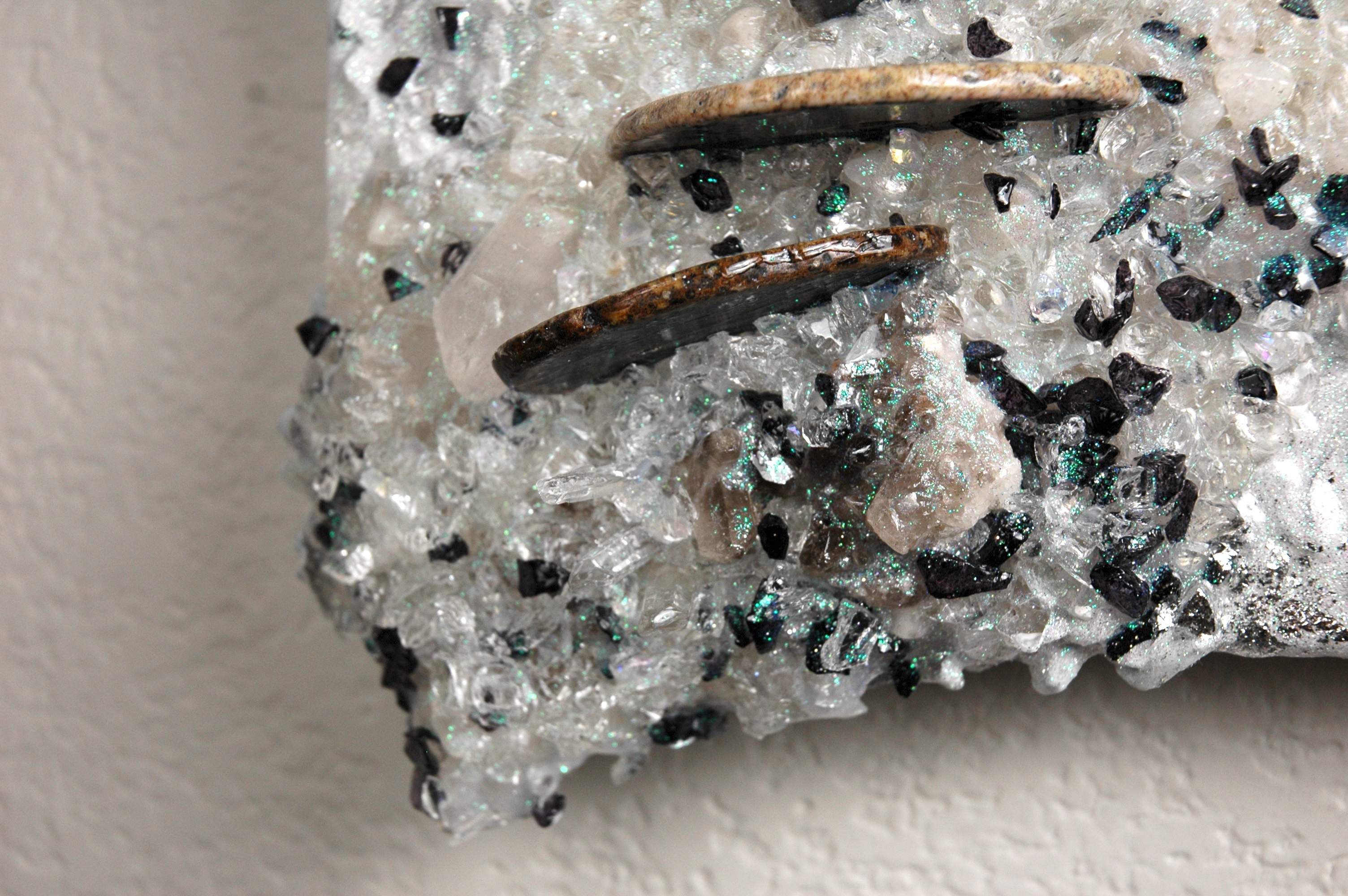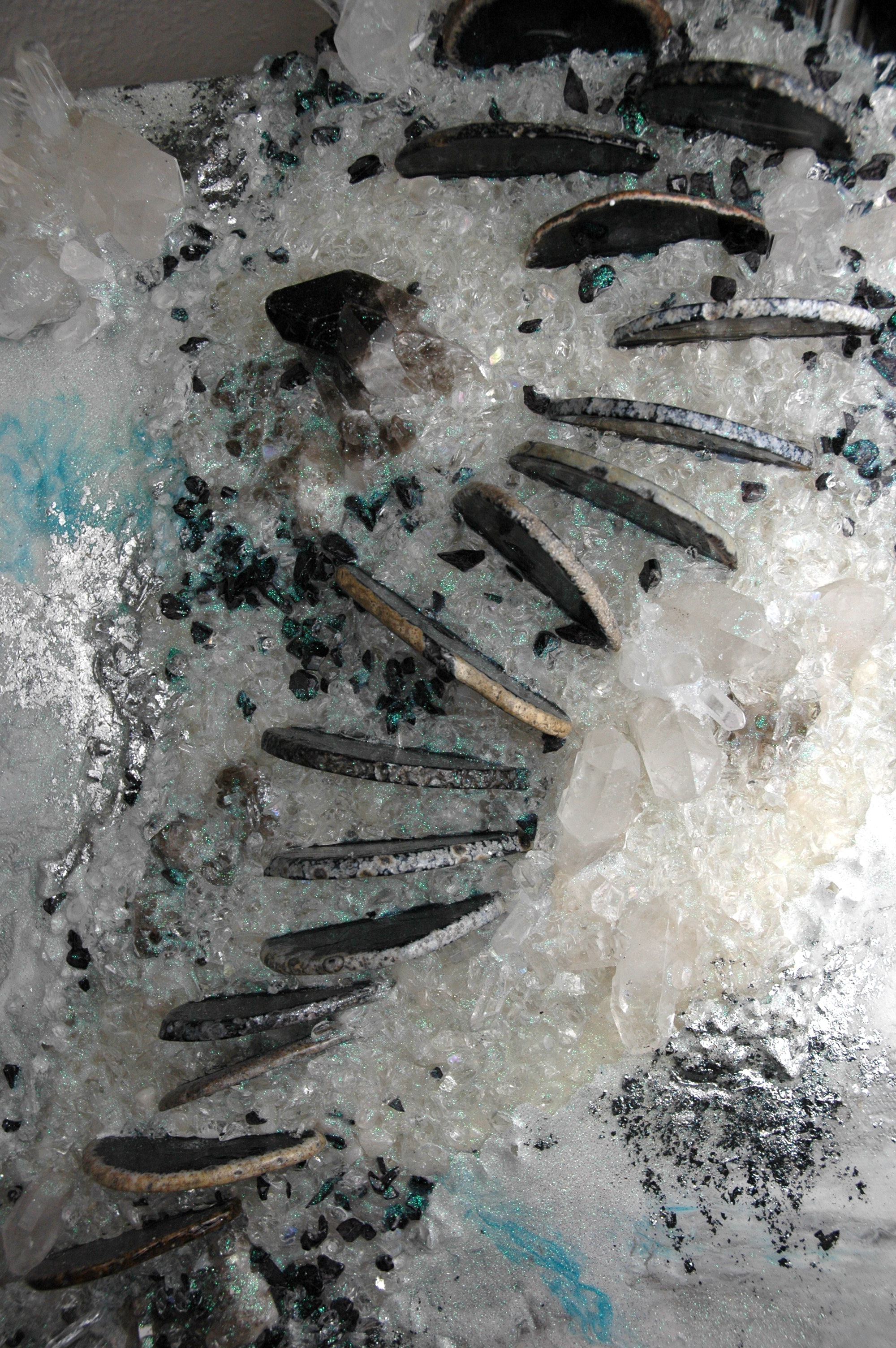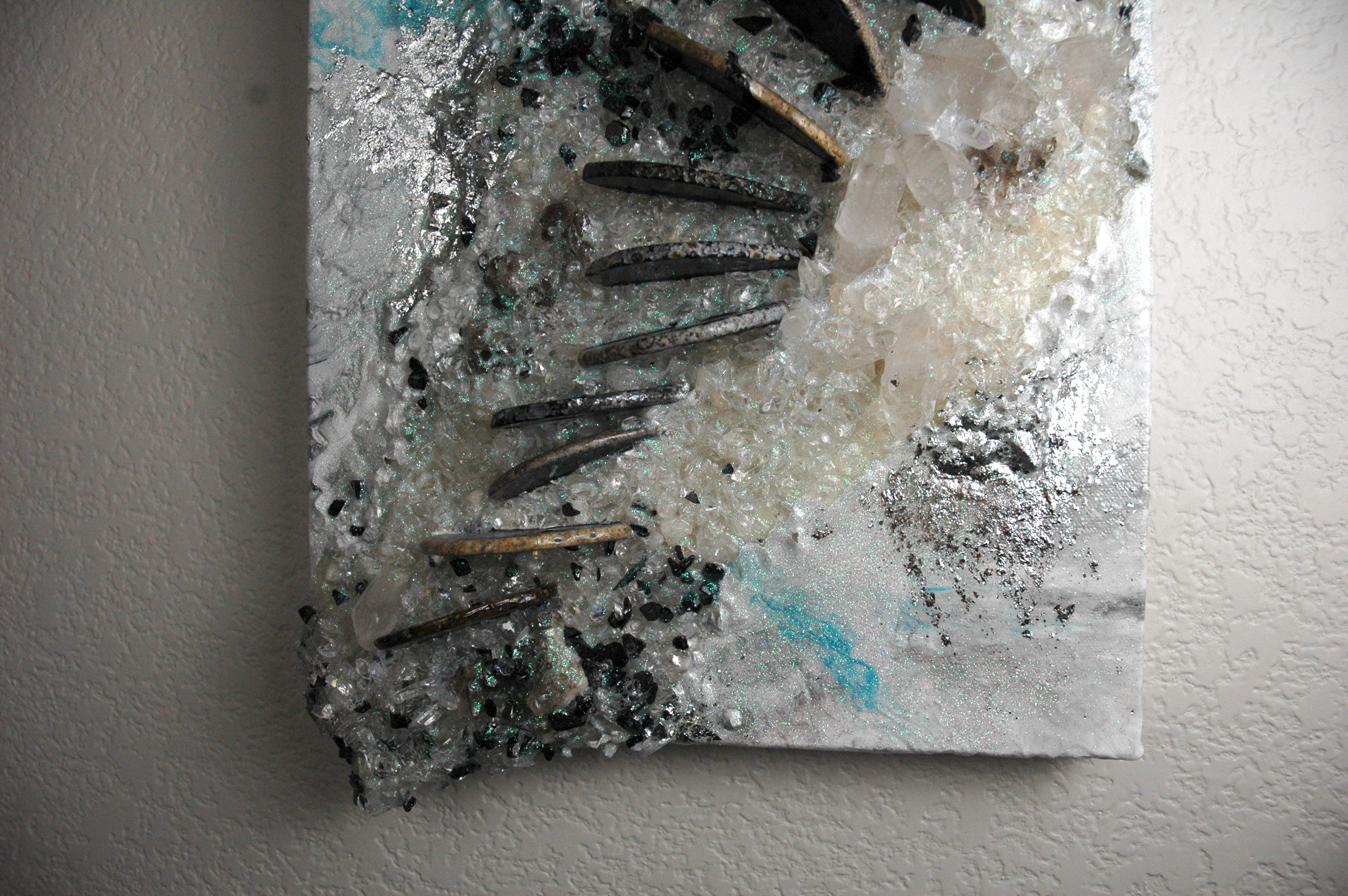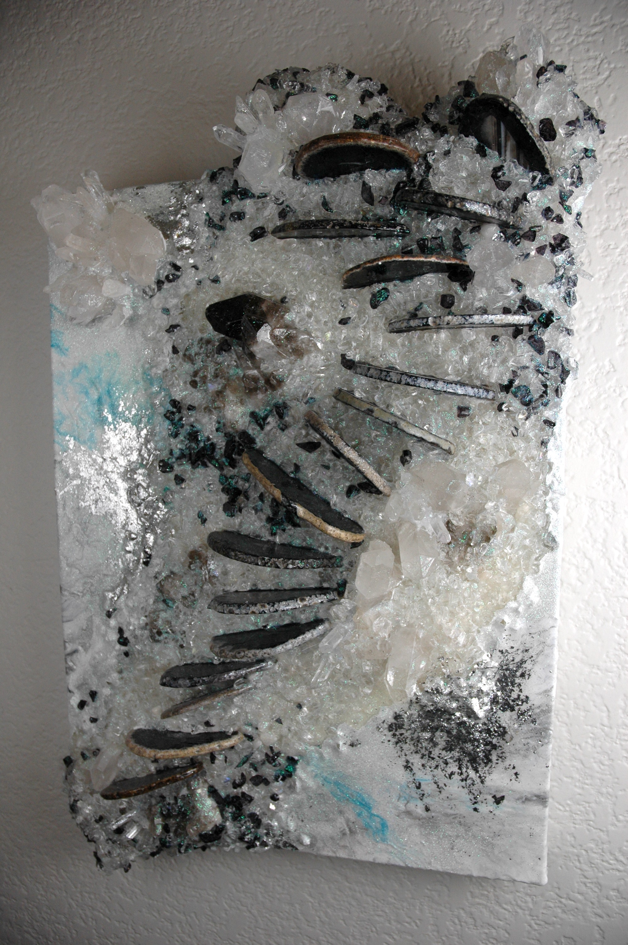 Since I had never applied geode slices to a canvas before—and hadn’t seen any artwork that used them in this way—there were no existing techniques or tricks for me to follow. However, my strong understanding of how my materials behave helped me develop a method to apply the slices with minimal support, preserving their delicate, thin shape. By strategically adding additional crystal pieces to specific areas I was able to enhance the overall look.