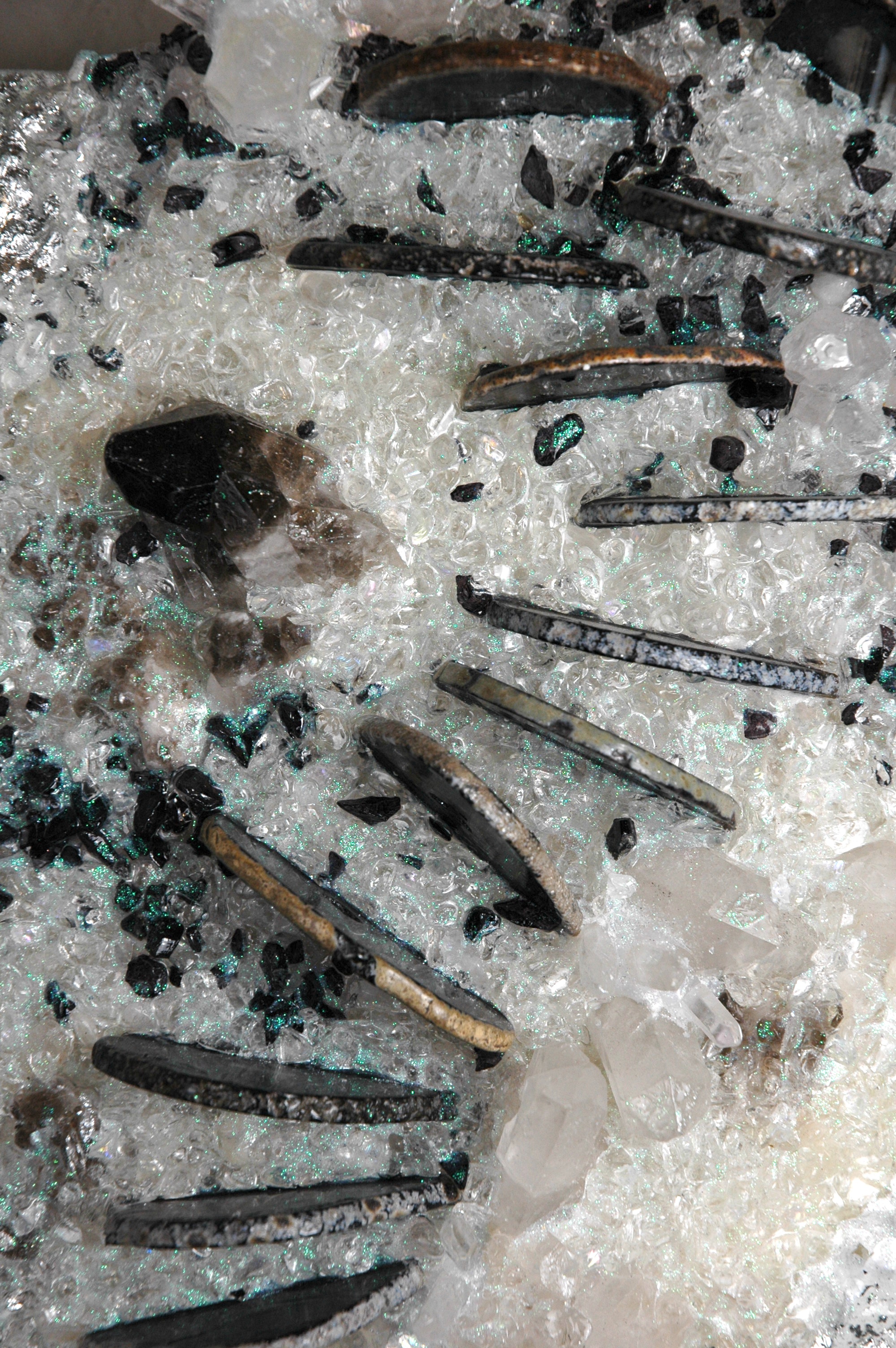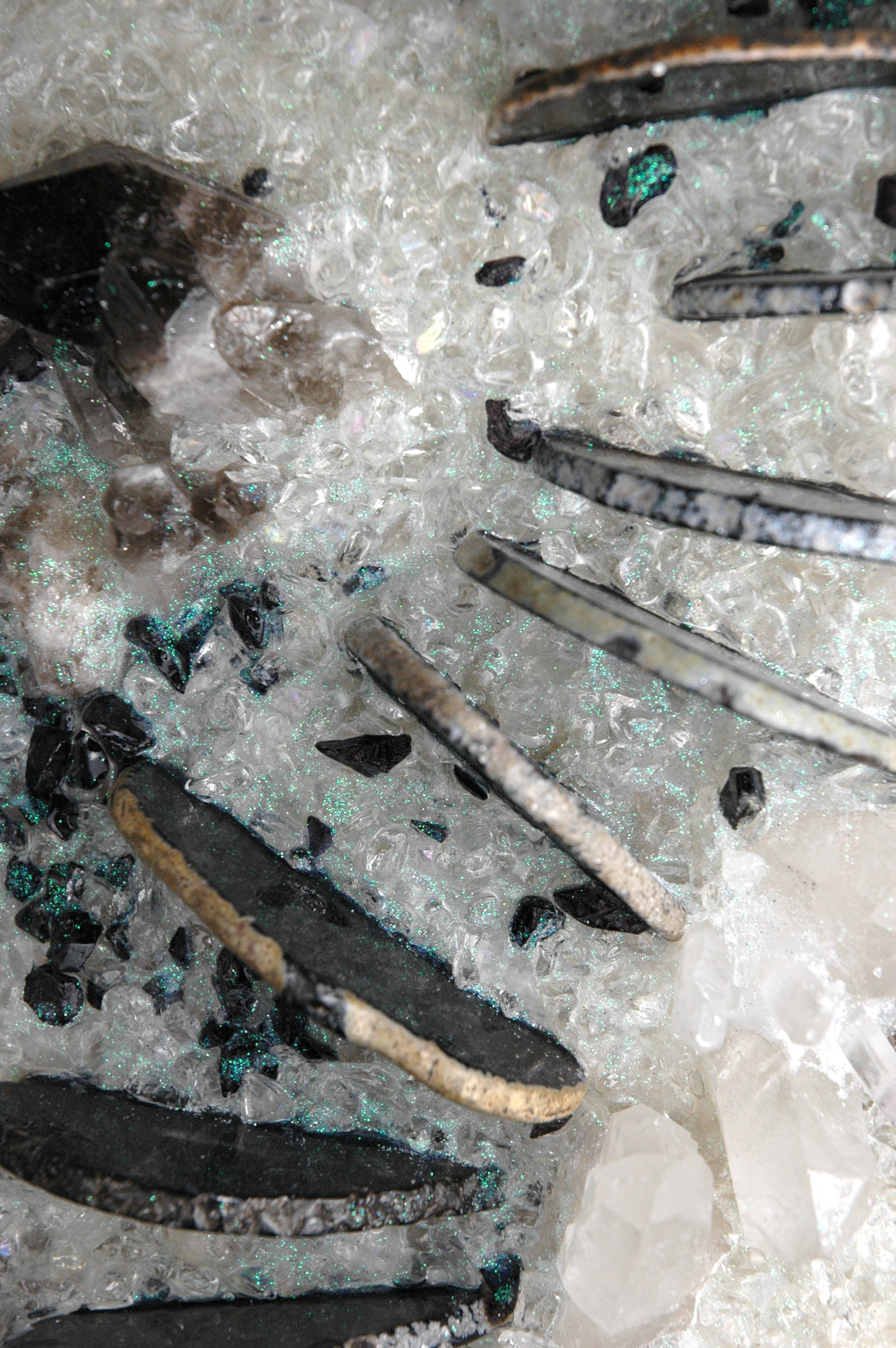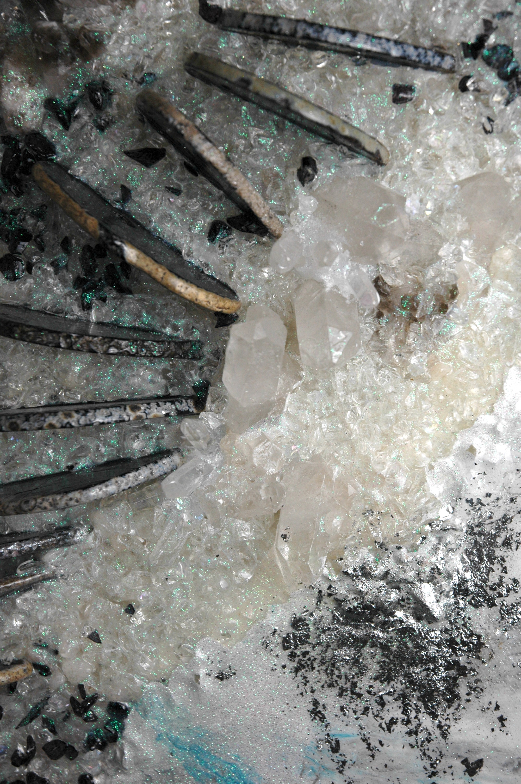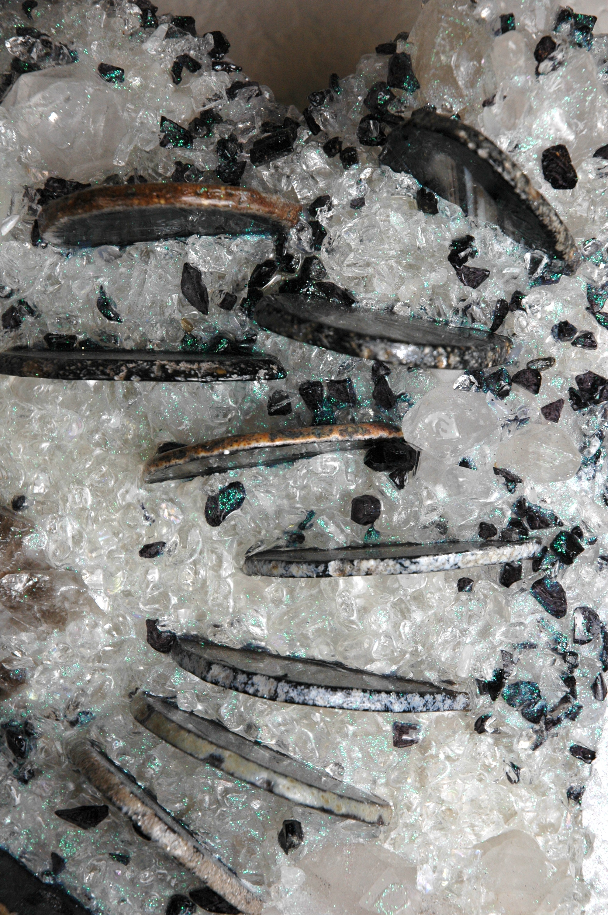 Since I had never applied geode slices to a canvas before—and hadn’t seen any artwork that used them in this way—there were no existing techniques or tricks for me to follow. However, my strong understanding of how my materials behave helped me develop a method to apply the slices with minimal support, preserving their delicate, thin shape. By strategically adding additional crystal pieces to specific areas I was able to enhance the overall look.
